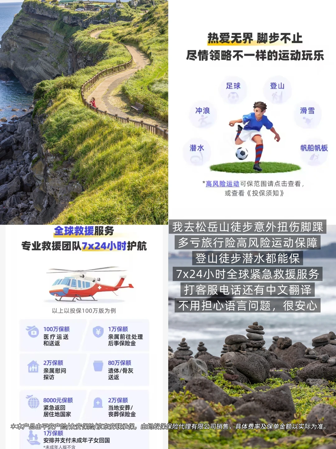 济州岛有很多好玩的户外运动,但要注意安全,像我去松岳山徒步,不小心一脚踩歪导致脚踝扭伤,多亏旅行险高风险运动保障,登山徒步潜水都能保,还有7x24小时全球紧急救援服务,打客服电话还有中文翻译,不用担心语言问题。