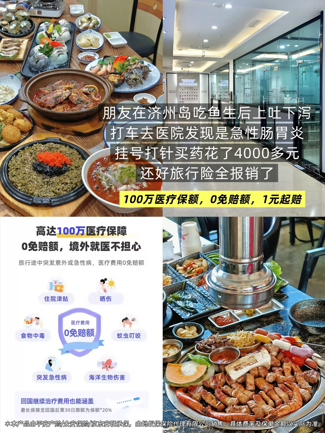 济州岛生冷海鲜、烤肉小吃多,稍不注意很容易肠胃不适,上次朋友吃鱼生后,晚上回酒店上吐下泻,打车去医院才知道是急性肠胃炎,挂号打针买药花了4000多元,还好旅行险有100万医疗保额,0免赔额,1元起赔,线上提交理赔材料后全报销了!
