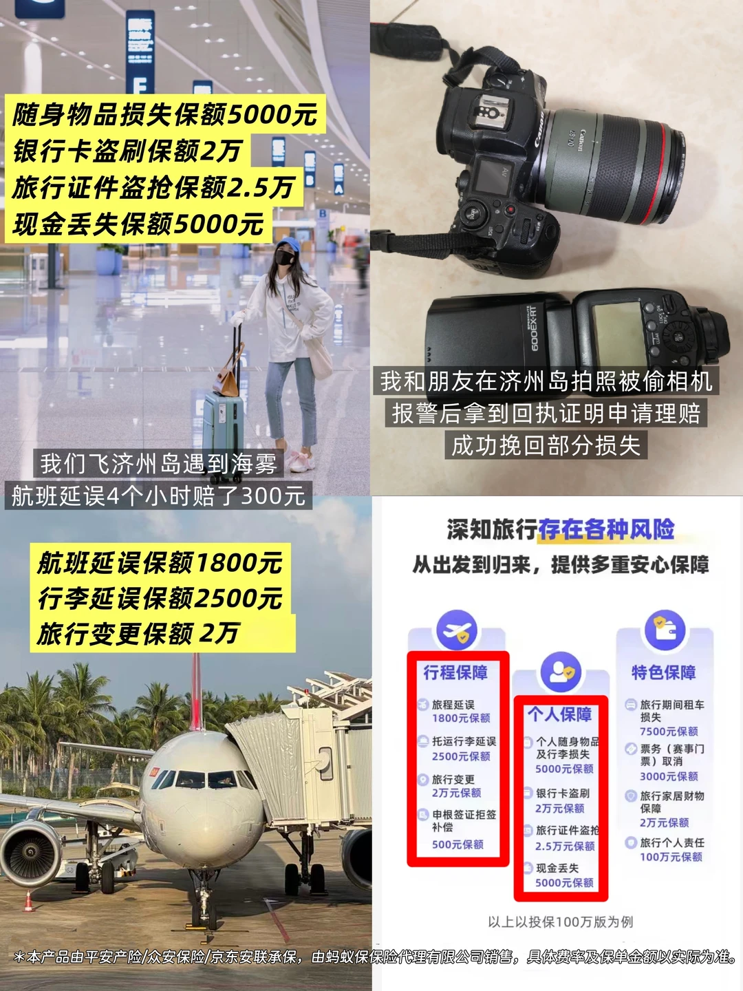 作为一个旅行博主,我每次出门都会带一堆拍照设备,比如相机、备用手机等,这次和朋友在济州岛拍照时,一不留心相机被偷,报警后拿到回执证明申请理赔,成功挽回部分损失,它有随身物品损失保额5000元,银行卡盗刷保额2万,旅行证件盗抢保额2.5万,现金丢失保额5000元。出门带上它,真的很安心!