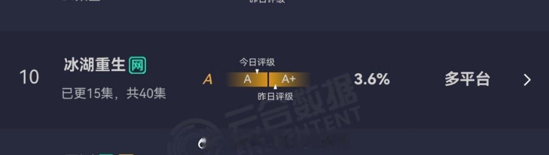 冰湖重生云合评级降为A。。。鹅桃联播,才播了一半,百指被九年前的《楚乔传》吊打,这成绩再跌感觉都会影响主演后续资源了 。。。