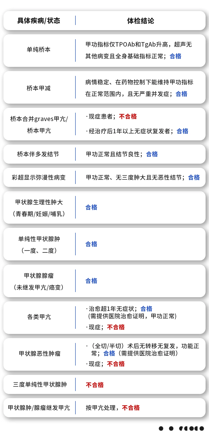 公务员体检手册规定,甲状腺三度肿大是不合格的,也就是如果你的甲状腺肉眼可见地肿大,且超过了胸锁乳突肌后缘,那就会被卡了。