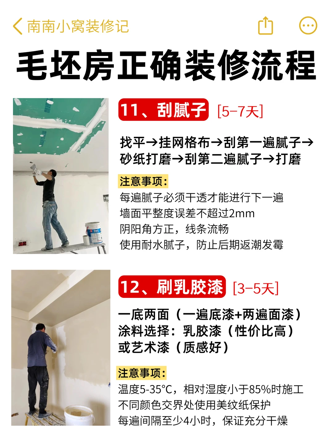 1️⃣1️⃣ 刮腻子(5-7天):每遍干透再打磨,墙面误差≤2mm