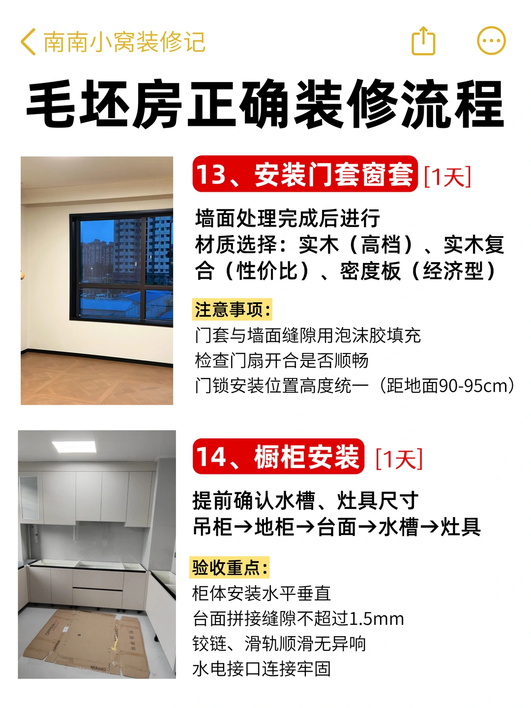 1️⃣4️⃣ 橱柜安装(1天):按吊柜→地柜→台面→水槽→灶具顺序