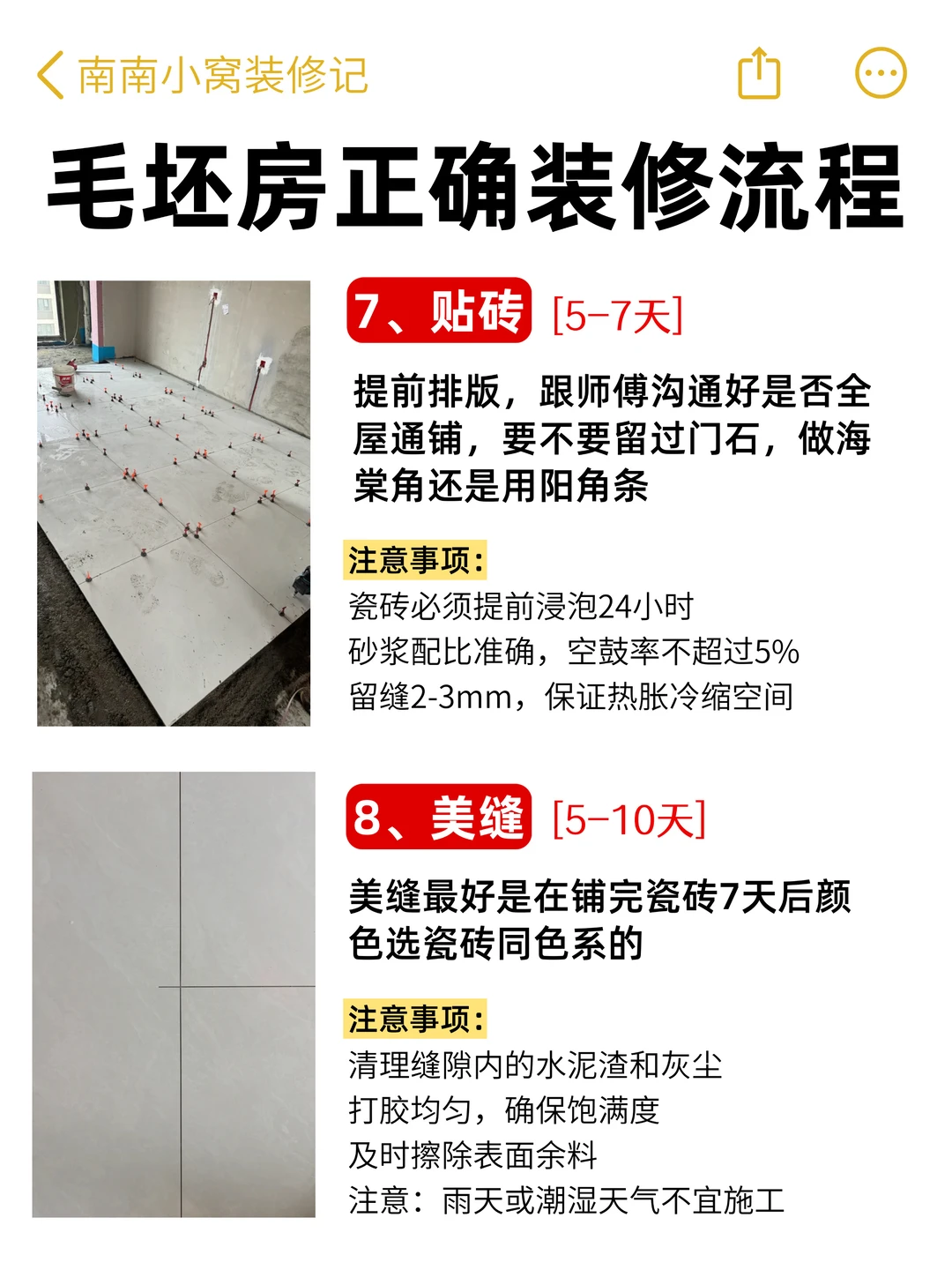 7️⃣ 贴砖(5-7天):瓷砖提前泡24小时,留缝2-3mm