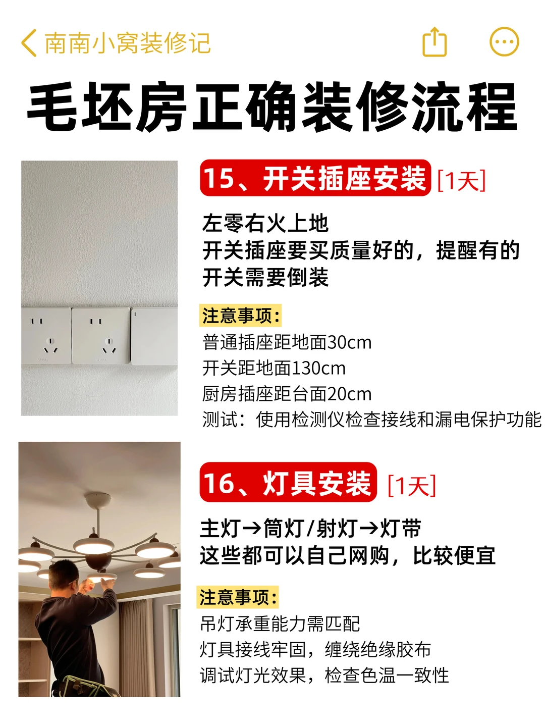 1️⃣6️⃣ 灯具安装(1天):主灯→筒灯→灯带,注意承重