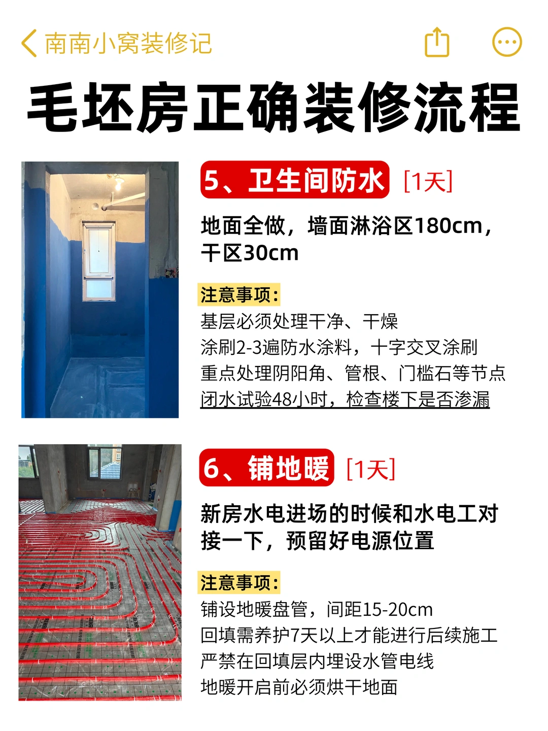 5️⃣ 卫生间防水(1天):墙面淋浴区刷1.8米,闭水试验48小时