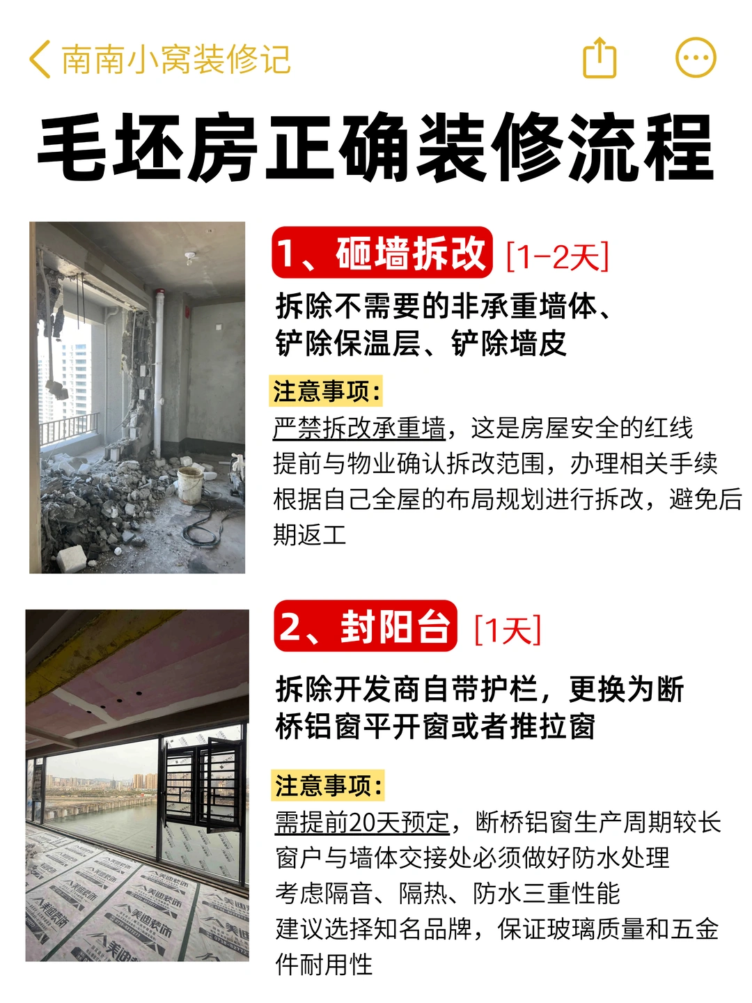 1️⃣ 砸墙拆改(1-2天):严禁动承重墙!先跟物业办手续