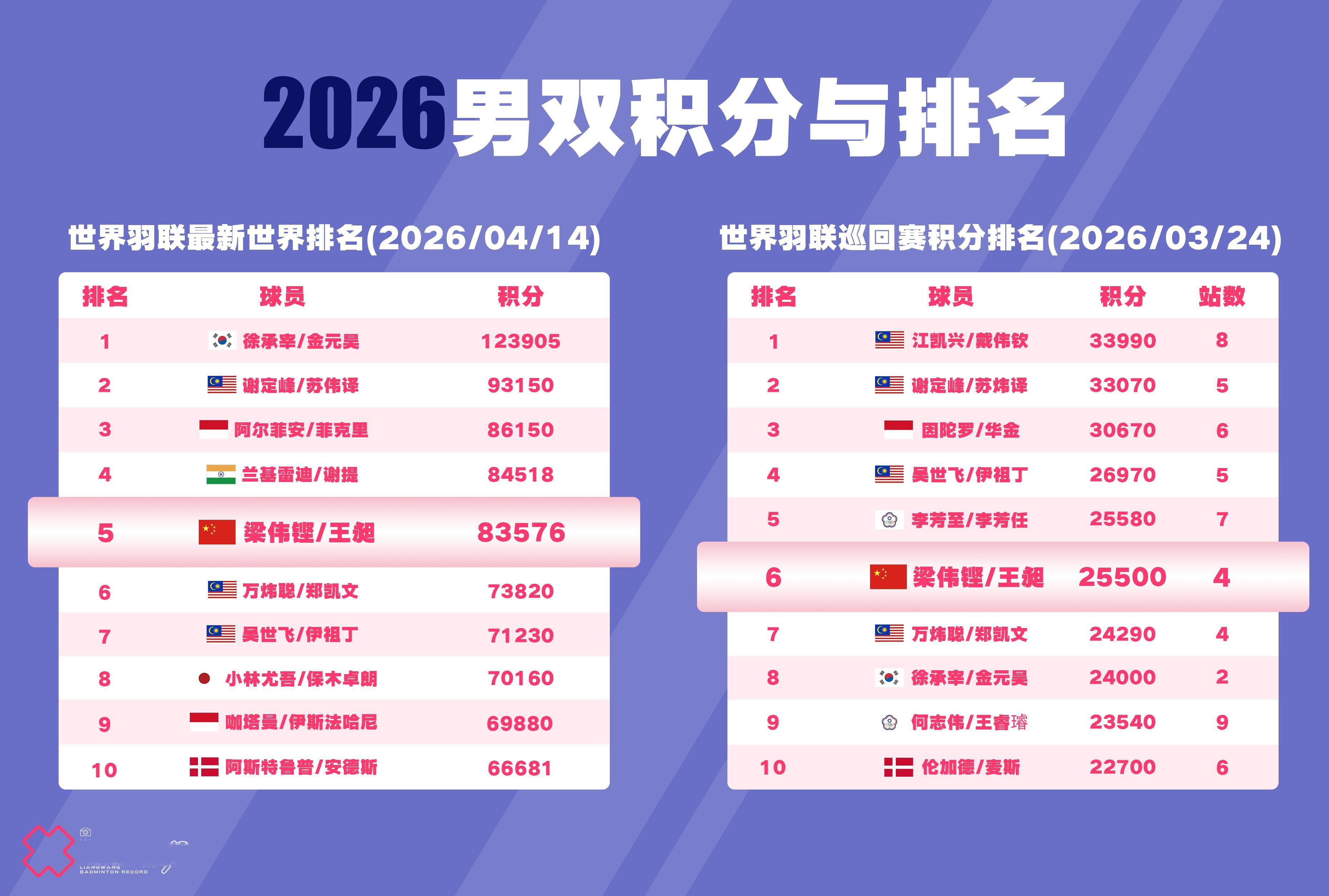 梁王驾到梁王组合 梁王加油 排名及积分更新BWF最新世界排名(2026/04/1