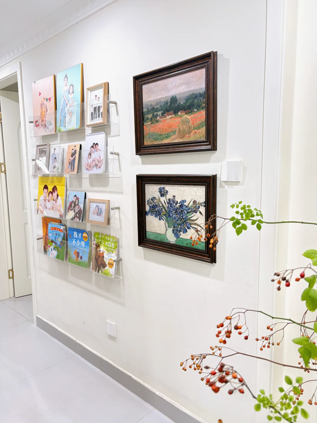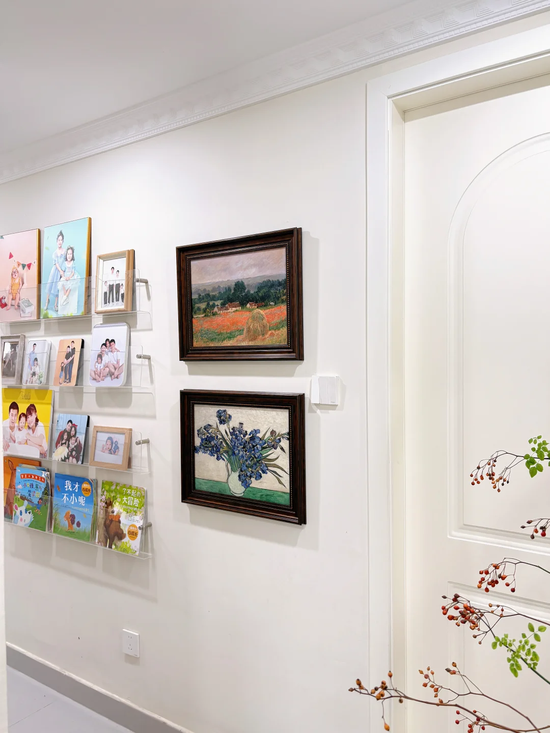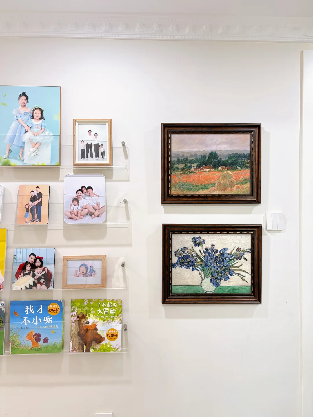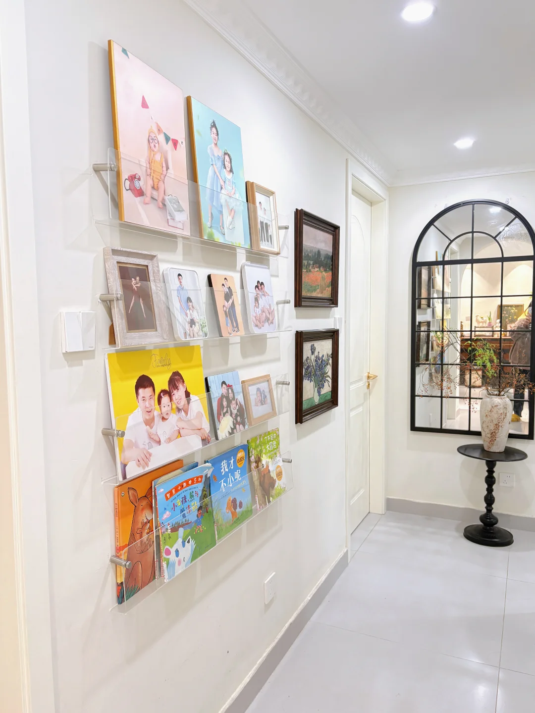 墙的另一侧,放了置物架,装了从恋爱到结婚,生娃,我人生轨迹的一个记录!每当深夜下班回家,路过走廊,我都会驻足停留下来,看着十年前的自己,看着时光给自己馈赠的礼物,我会告诉自己此刻再累,十年后的你也会怀念现在的你呀!