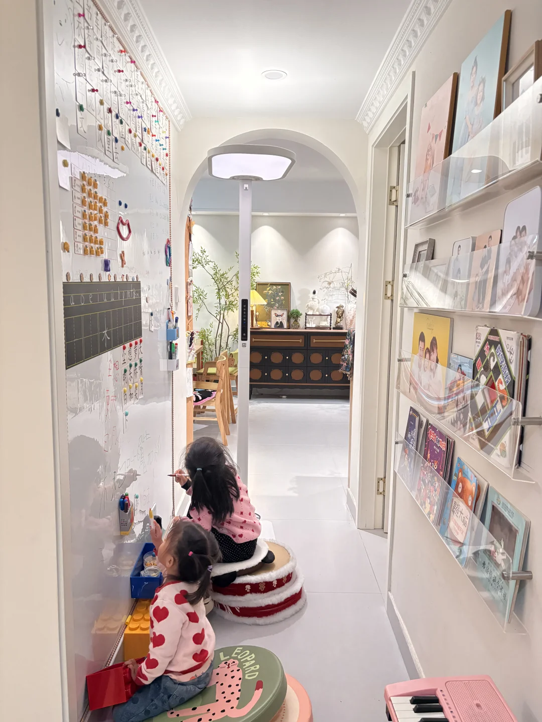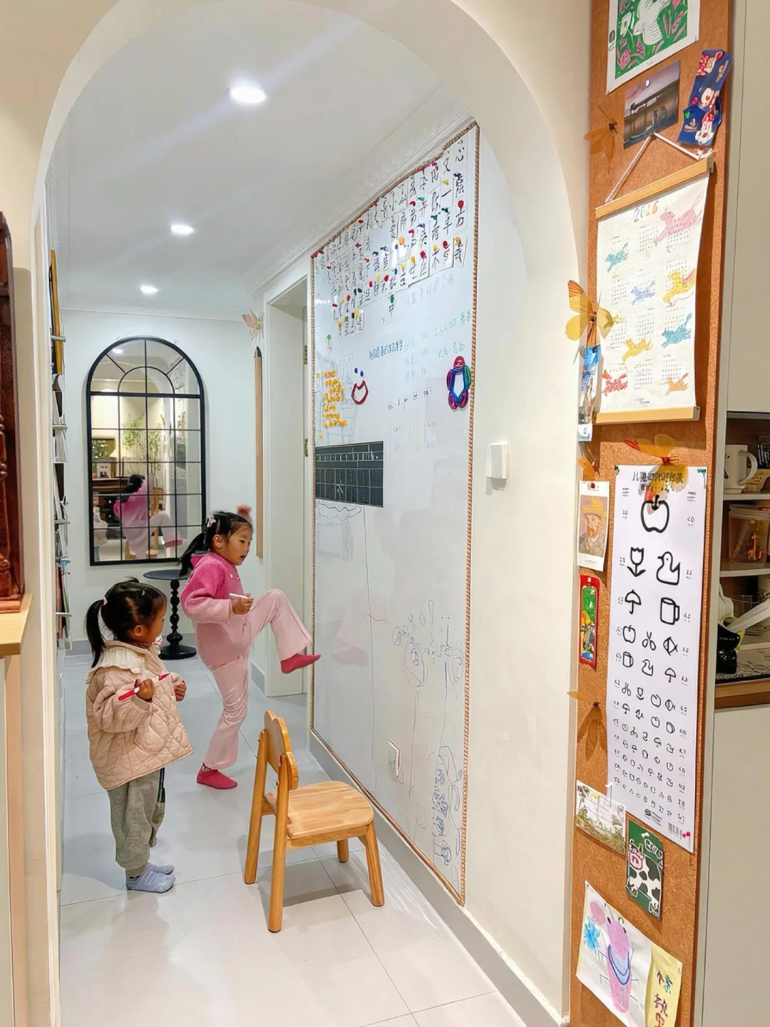 装修的时候最头疼的就是这大走廊真的是太浪费了,装了白板后,娃整体都在墙上画画🎨两个娃的关系也变得格外幸福!实现了画画自由!