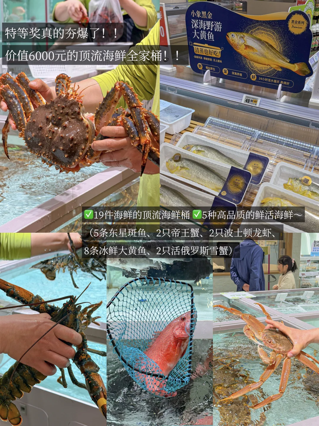▪特等奖是价值6000r顶流海鲜全家桶!足足整整19件海鲜!!有5种高品质的鲜活海鲜~包括了5条东星斑鱼、2只帝王蟹、2只波士顿龙虾、8条冰鲜大黄鱼、2只活俄罗斯雪蟹!真的夯爆了!一等奖是1299r的帝王蟹一只!小象超市这次开业活动太豪迈了~