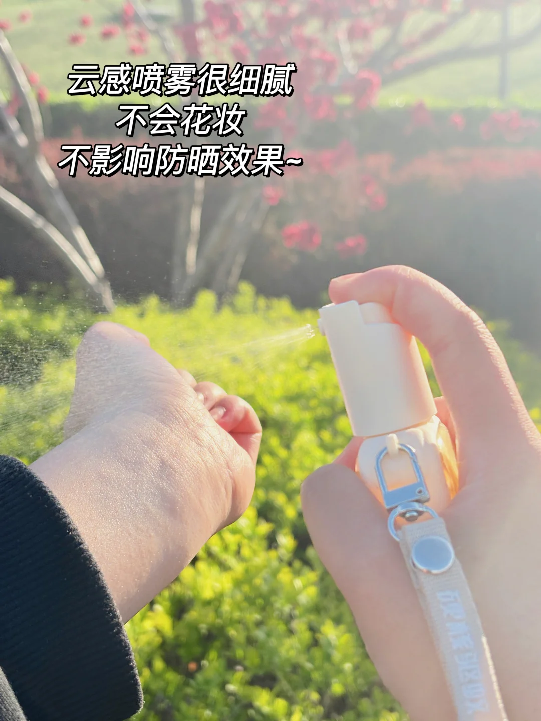 这个系列的细节也很戳我,可拆卸挂扣/纽扣,加上它是没有盖子的,随拿随喷不用拧盖子,喷雾很细腻,范围也很广,还可以倒过来喷,后背脚踝也能全覆盖,怎么放都不漏液,而且可以过安检!带上飞机毫无压力~