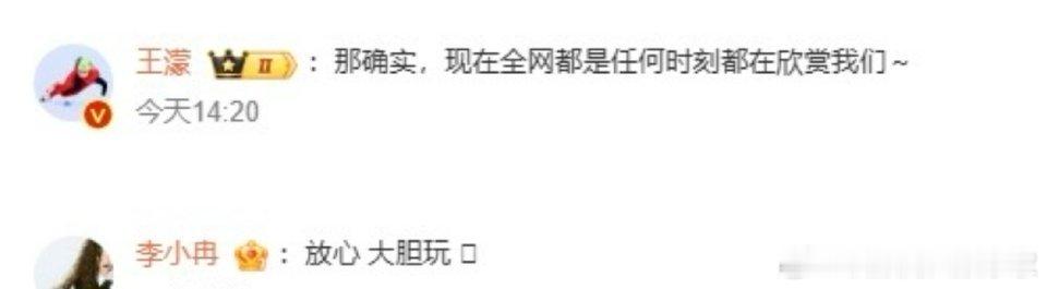 反正后台看她们仨,全程都在唠嗑,说说笑笑的,也特别努力,态度端正,现场还在练习舞蹈呢,说实话我都不担心票数,感觉她们仨都挺有观众缘的,哈哈哈王濛李小冉回复唐艺昕