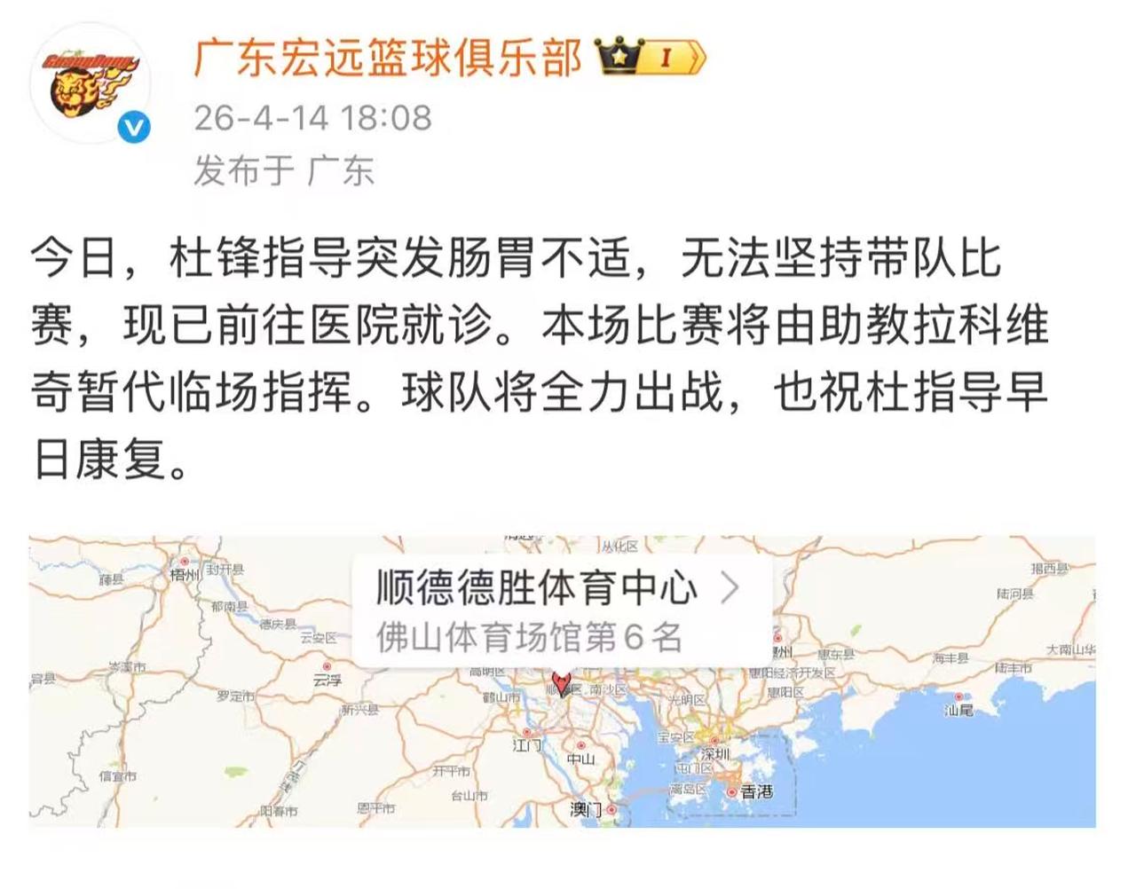 就在今晚广东队主场迎战宁波队的比赛开打前,球迷们突然收到了一个让人揪心的消息——球队主教练杜锋指导,突发肠胃不适,实在撑不住了,只能紧急前往医院就诊,今晚没法带队指挥比赛了。