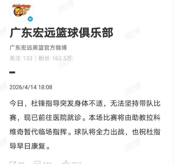 杜锋因为肠胃不适紧急前往医院就医无法指挥今晚广东队和宁波队的比赛,没有杜锋的指挥,广东队半场39:46落后宁波队。