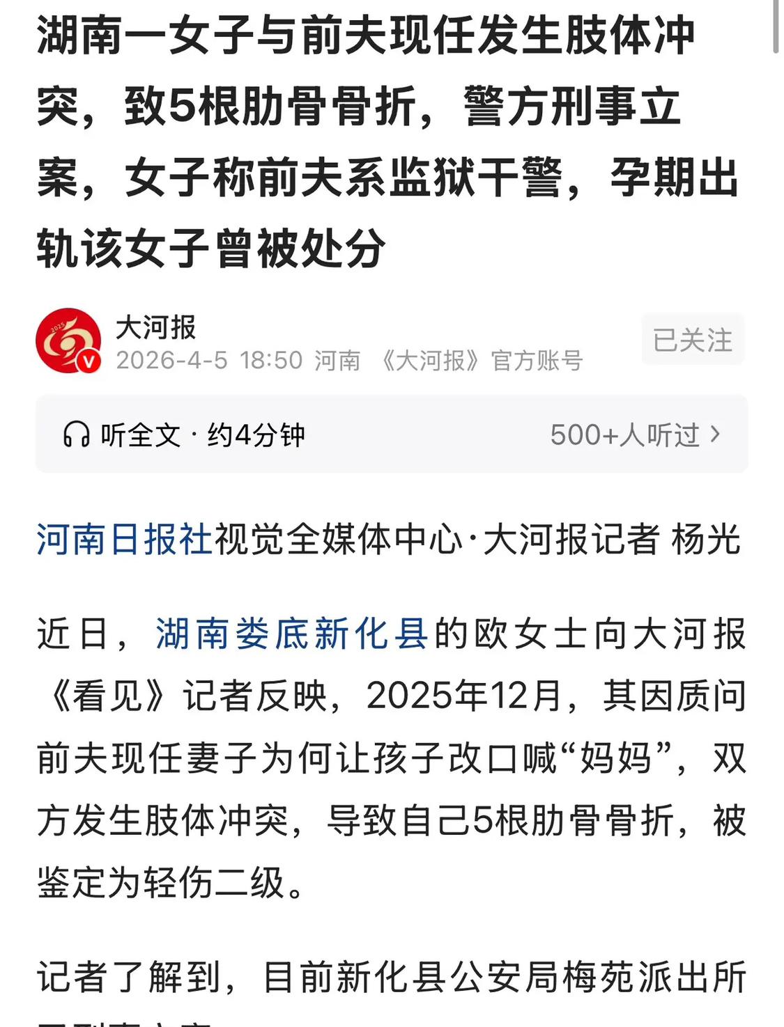湖南,女子在怀二胎的时候,小其7岁丈夫出轨女同事。女子发现后,将二人举报,因二人都是监狱干警,导致被记大过处分。随后,女子与丈夫协议离婚。谁知,女子前脚离婚,前夫后脚就把女同事娶了回去。女同事还逼着孩子管她叫妈妈,威胁不叫妈妈就不给买玩具。女子得知后,火冒三丈,找上门去,双方发生肢体接触,导致女子5处肋骨骨折,造成轻伤二级。没想到,对方反咬一口:她上门滋事,自己才是受害者。网友:离婚了还纠缠什么?