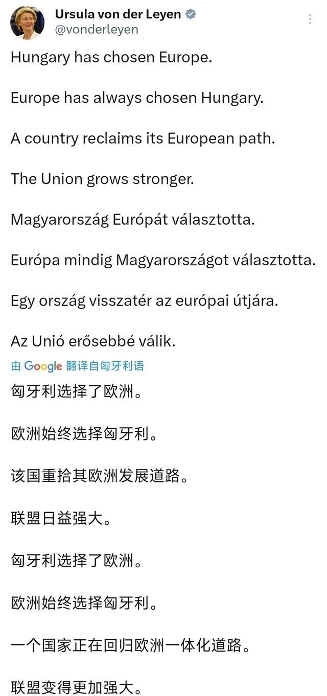 欧尔班败选后,欧盟委员会主席冯德莱恩日前写道:“匈牙利选择了欧洲。欧洲始终选择匈牙利。该国重拾其欧洲发展道路。联盟日益强大。”欧尔班败选,冯德莱恩很兴奋,她忍刺头欧尔班已经很久了。一句“匈牙利选择了欧洲”,意味深长。