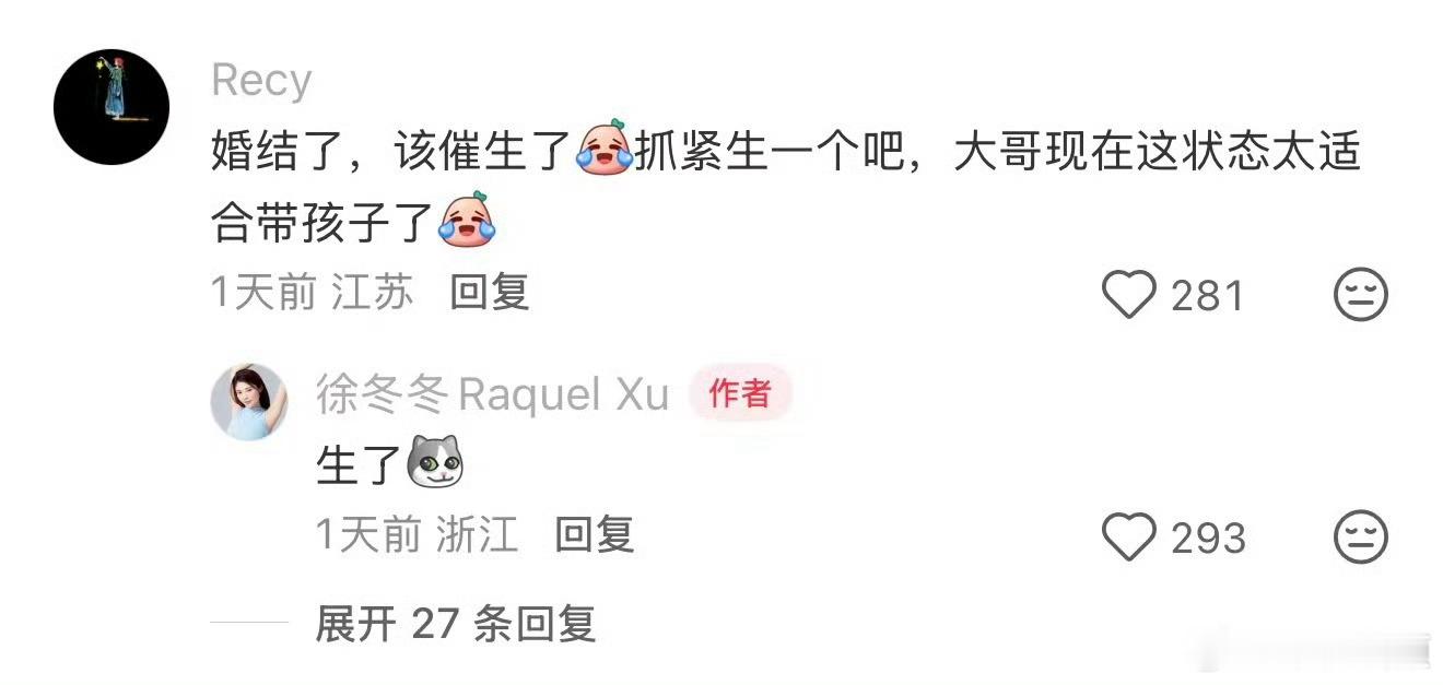 徐冬冬大大方方回应网友生了 徐冬冬活人感是真重啊,经常活跃在评论区和大家聊天,面对催生话题时也是大大方方的,真的很有好感!!