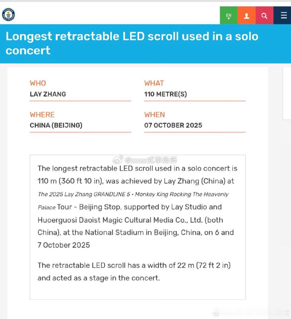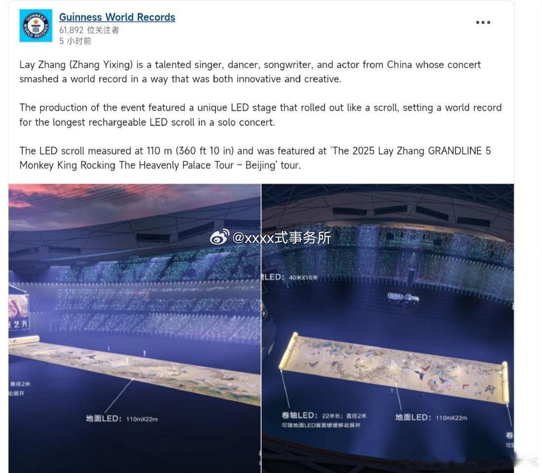 吉尼斯世界纪录发布:张艺兴的鸟巢演唱会以创新方式打破了一项世界纪录:卷轴式的LED舞台,创造了个人演唱会可伸缩LED卷轴舞台最长的世界纪录。这条LED卷轴舞台长达110米(360英尺10英寸)🐮🐮张艺兴鸟巢演唱会