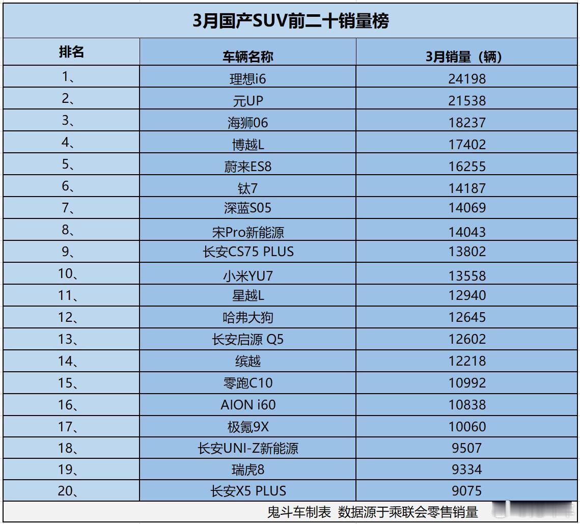 国产SUV卖火了!3月销量榜出炉 17款销量过万 元UP第二