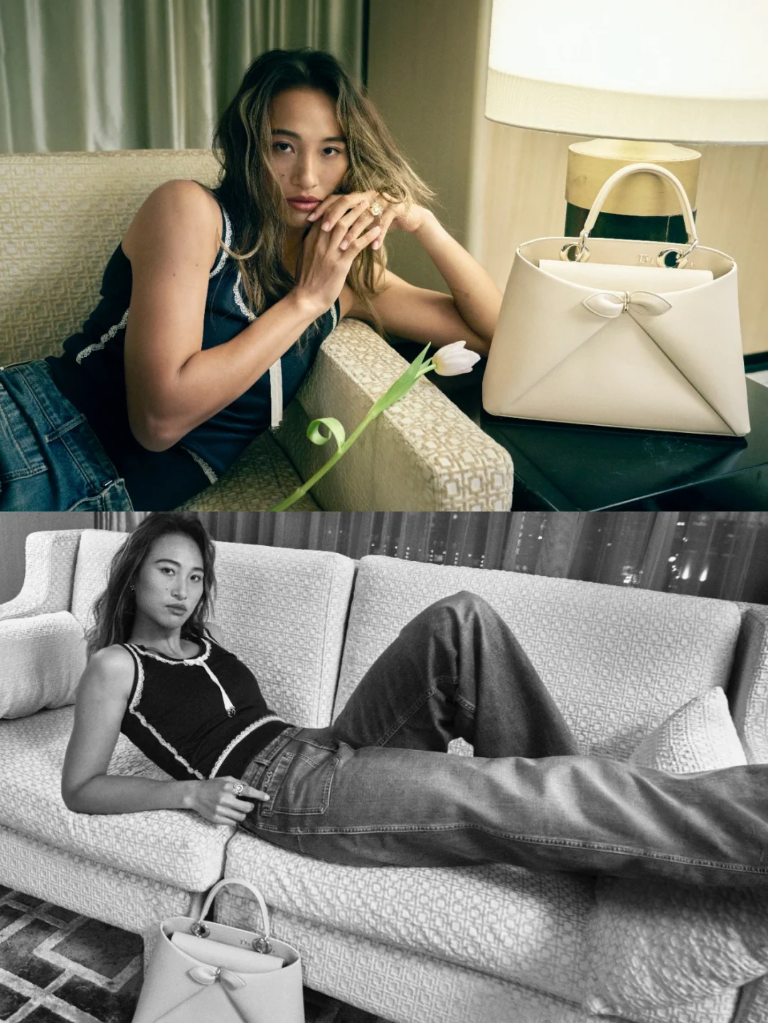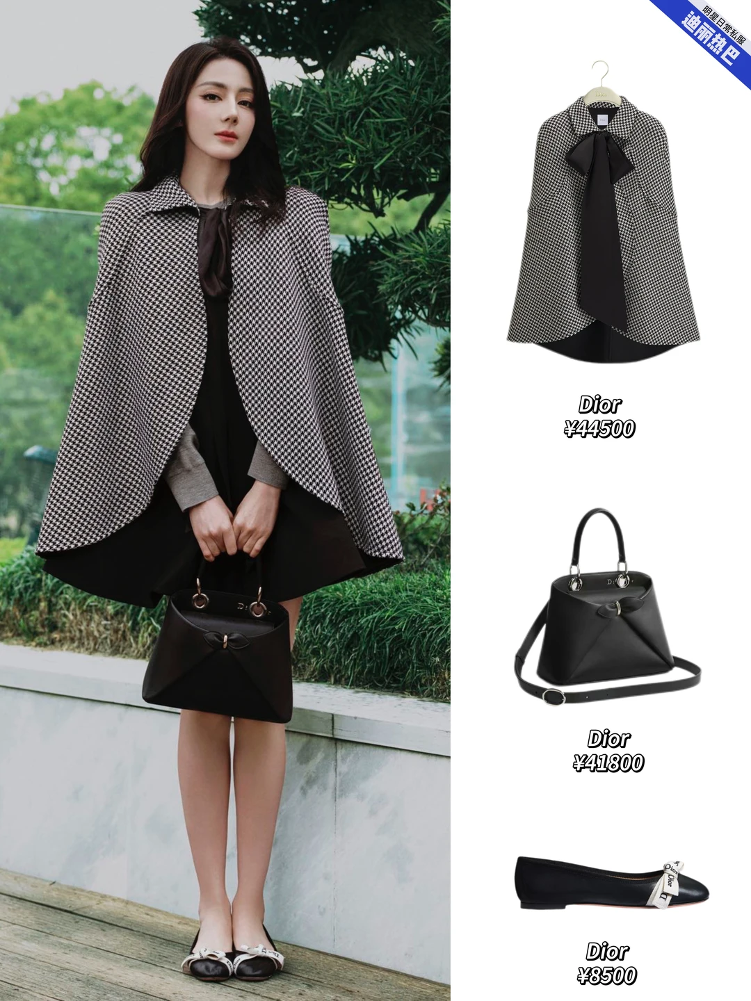 热巴也用自己的方式演绎了品牌的法式浪漫。千鸟格斗篷搭配同系列蝴蝶结手提包,将Dior的优雅与复古感拉满,灵动又贵气。