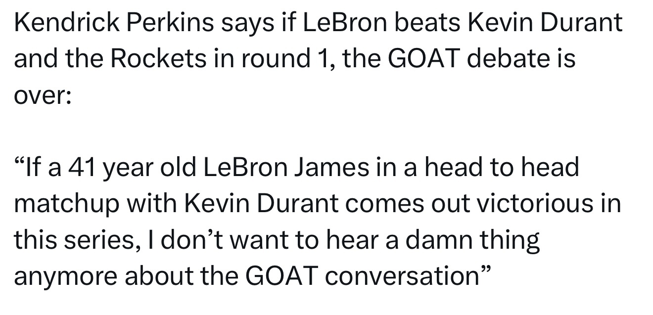 “如果一位41岁的勒布朗·詹姆斯在与凯文·杜兰特的正面对决中赢下这轮系列赛,那关于GOAT的讨论,我就再也不想听任何废话了。”