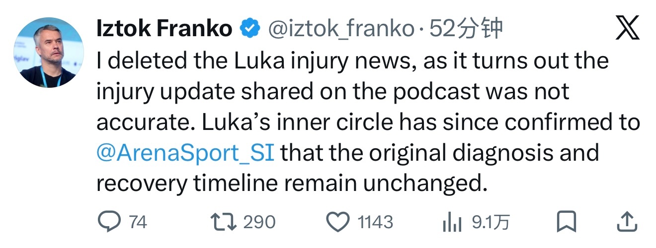 随后记者更新:我删除了关于卢卡受伤的消息,因为播客上分享的伤情更新并不准确。卢卡的内部人士证实,最初的诊断和恢复时间表保持不变。