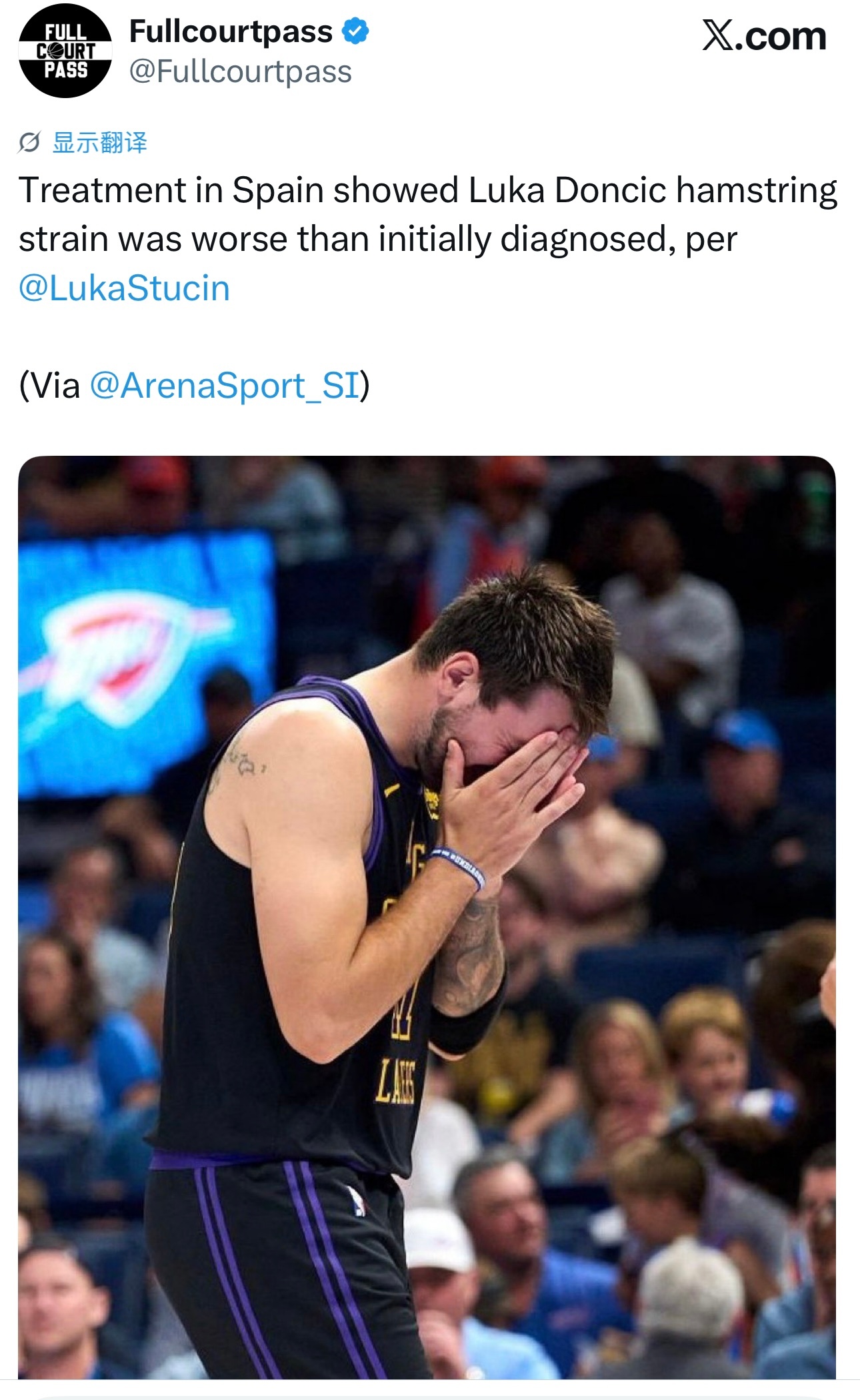 斯洛文尼亚记者此前报道,在西班牙接受的治疗结果显示,东契奇的腿筋拉伤比最初诊断的更为严重。