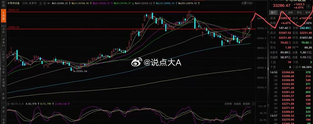 半导体设备大涨,半导体设备、cpo、人形机器人技术走势分析今天科技股继续强势,半导体设备盘中一度大涨5.54%,cpo继续中阳线,整体表现都不错,但是随着持续拉升,压力也越来越大,需要一定调整才能继续上涨,技术分析如下:1、半导体设备。昨天突破到颈线位附近后,收了一根小阴线,今天最度大阳线,突破了M头的颈线位,下一个压力位在前期高点附近,还有空间。但是M头压力是客观存在的,在M头部需要维持一段时间,才能有第二波行情,没有在里面这个位置已经不能追了。2、人形机器人。中阳线,和大盘走势差不多,5天均线不破,继续看涨,下一个压力位为60日均线,还有空间,接下来两天还能继续涨,突破60日均线后,再考虑T。3、CPO。本次行情领头羊,涨了20来个点了,没有一个像样子调整,没有进的就等吧。想追高的,控制好仓位。
