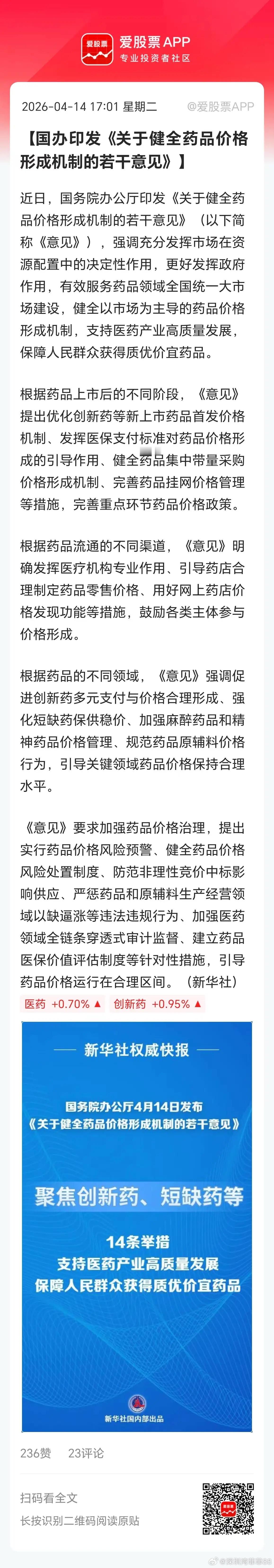 盘后创新药来利好了,国办针对药品价格出台指导《意见》,总共14条举措!这是2015年以来首个相关的顶层文件。