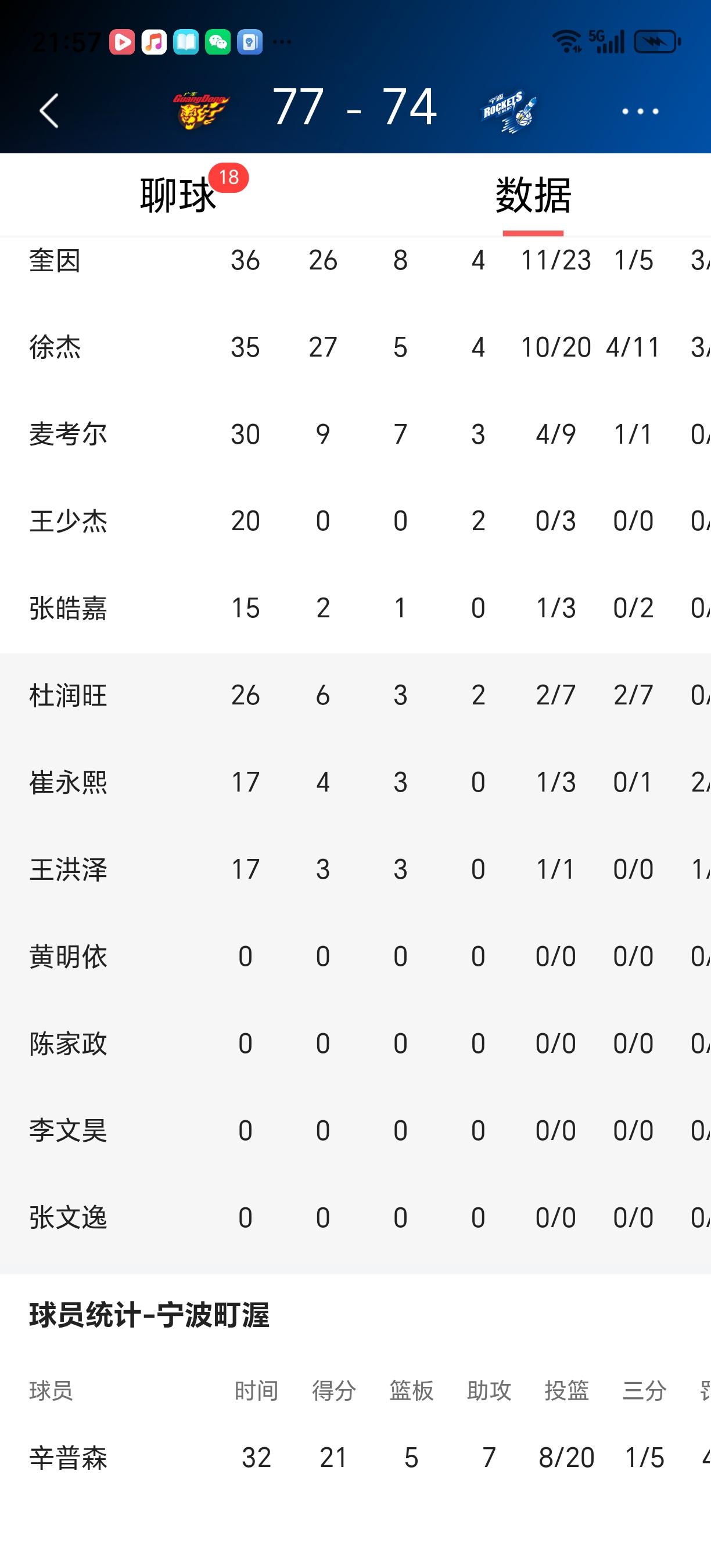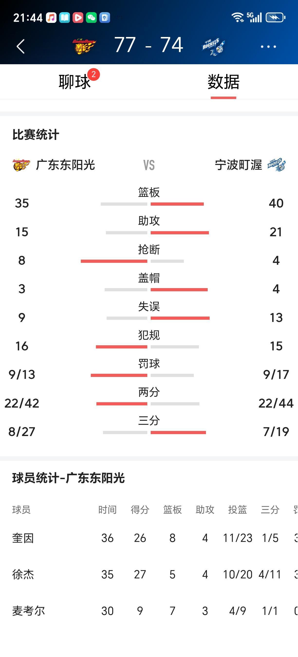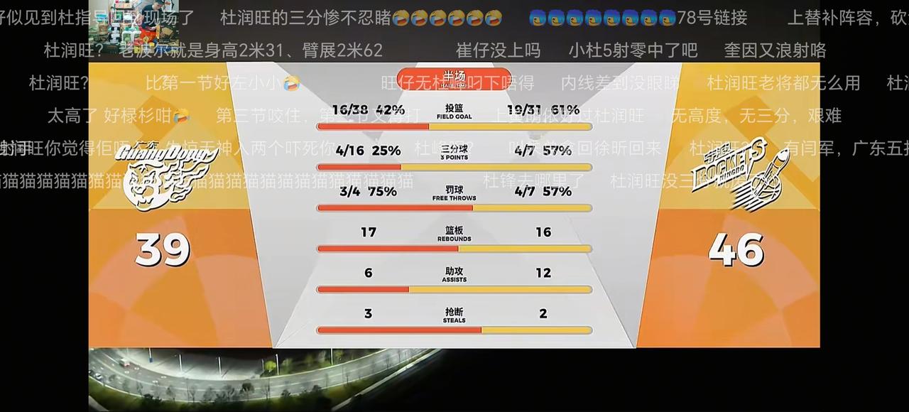 今晚胡明轩因伤坚持不住休战,主教练身体不适入院,半场一度落后15分,我是真担心又主场翻船,好在徐杰和奎因能坚挺地站出来,上半场才能紧咬比分把比分追近至39:46结束上半场。