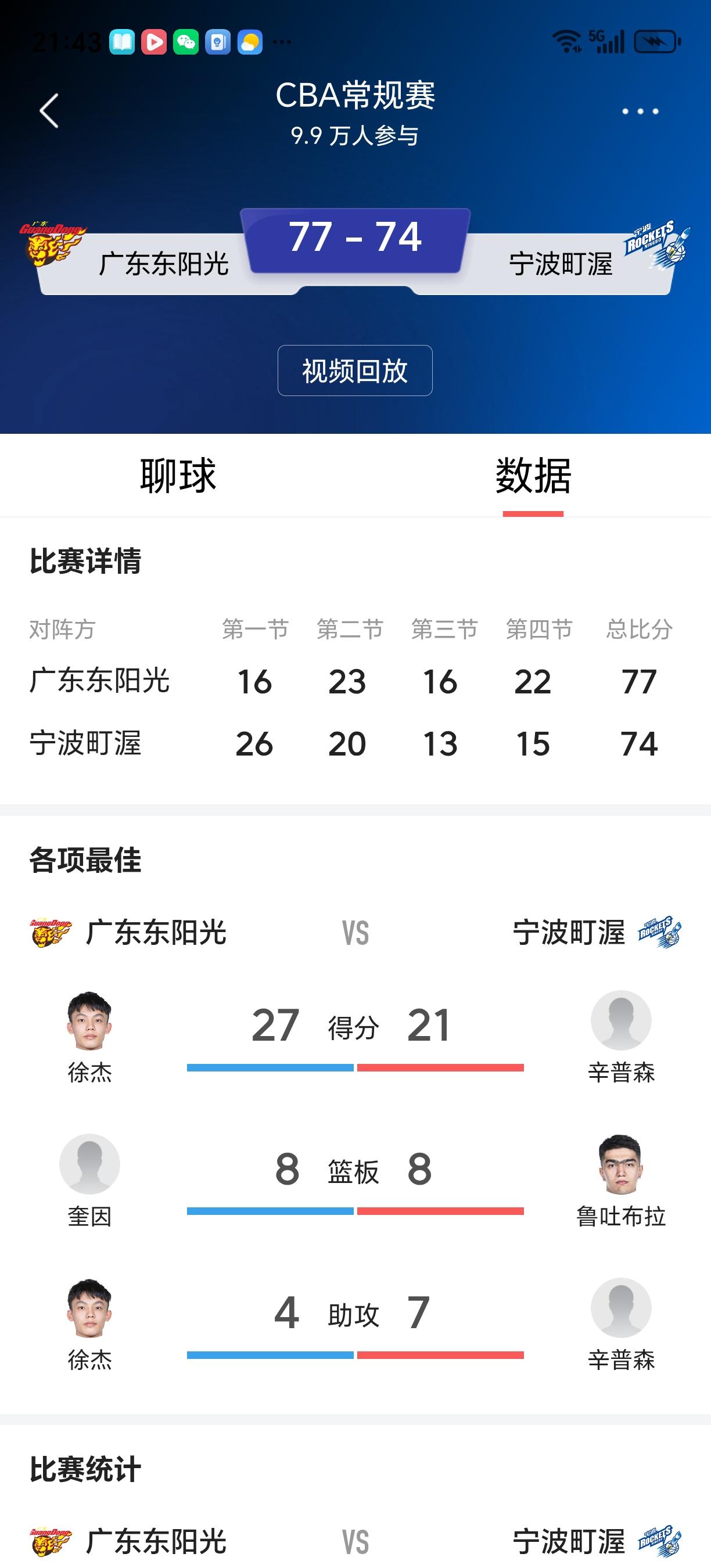 D、崔永熙出场17分钟,3投1中、三分球1中0、罚篮2中2,得4分3板2盖帽尤其是75:74时,徐杰被对方推倒,两人抢下他的球要上篮时被崔永熙从后盖下为争胜立下了头功,所以他的正负值是+8全队最高。