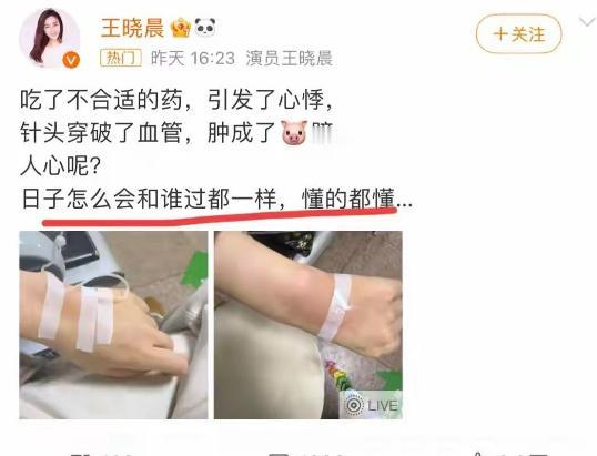 2026年4月13日,演员王晓晨在社交平台发布的一条输液动态迅速引爆舆论。画面中,她手臂缠着输液管,配文"吃了不合适的药,引发了心悸,针头穿破了血管,肿成了猪蹄…人心呢?日子怎么会和谁过都一样,懂的都懂…"。
