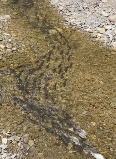 故事很简单。当地一位女子独自去溪边散步,走到浅滩,突然发现水里不对劲。她低头一看,整整齐齐的一队鱼,正对着来水往上冲,身体轻盈,劲头十足。