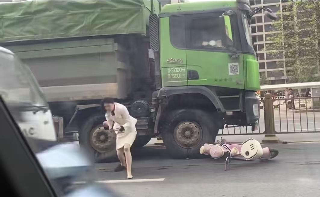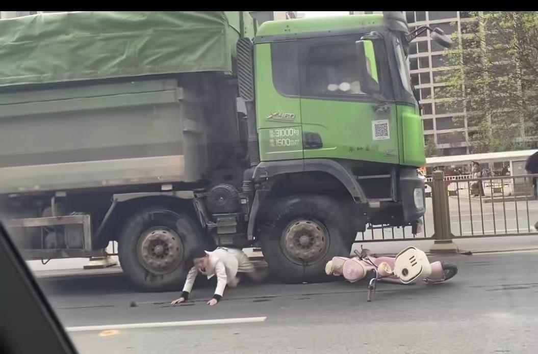 一辆大货车和一辆电动摩托车发生了碰撞,摩托车散架了,女车主被摔到大货车脚去了,周围的路人不敢看,以为这次事故会非常严重,但是她自己却从地上爬了出来,拍了拍身上的尘土,说的第一句话是我的丈夫、我的孩子,我的事业,我的未来我保住了。