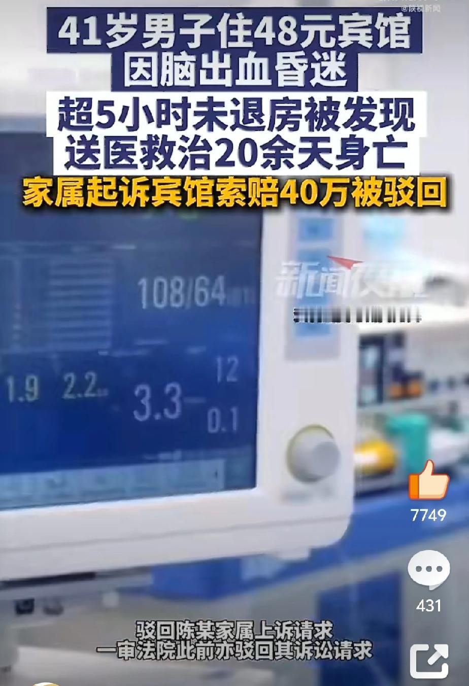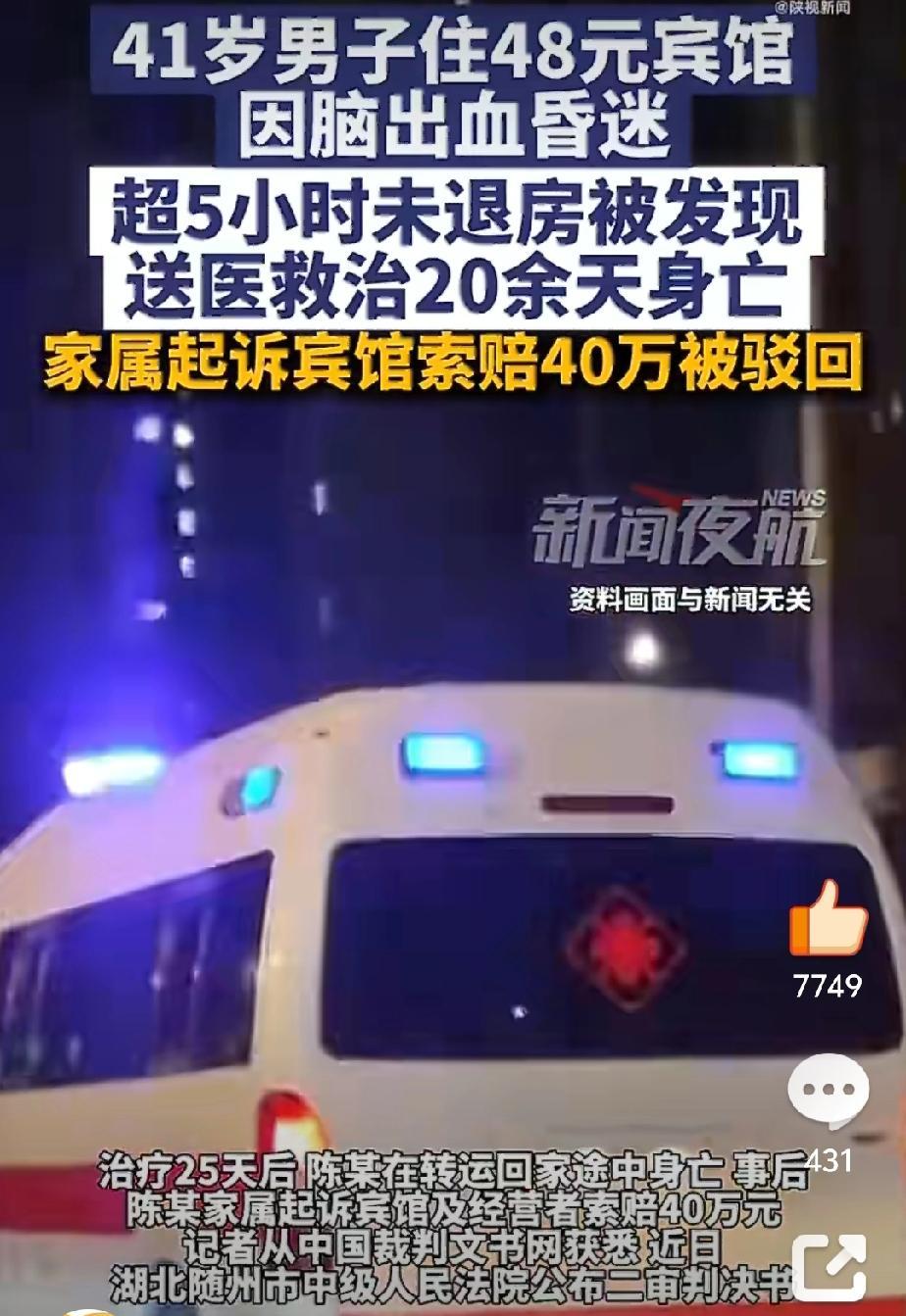 相反,男子家人一纸诉状将宾馆告上法庭,要求赔偿他们40万元。结果被法院驳回。