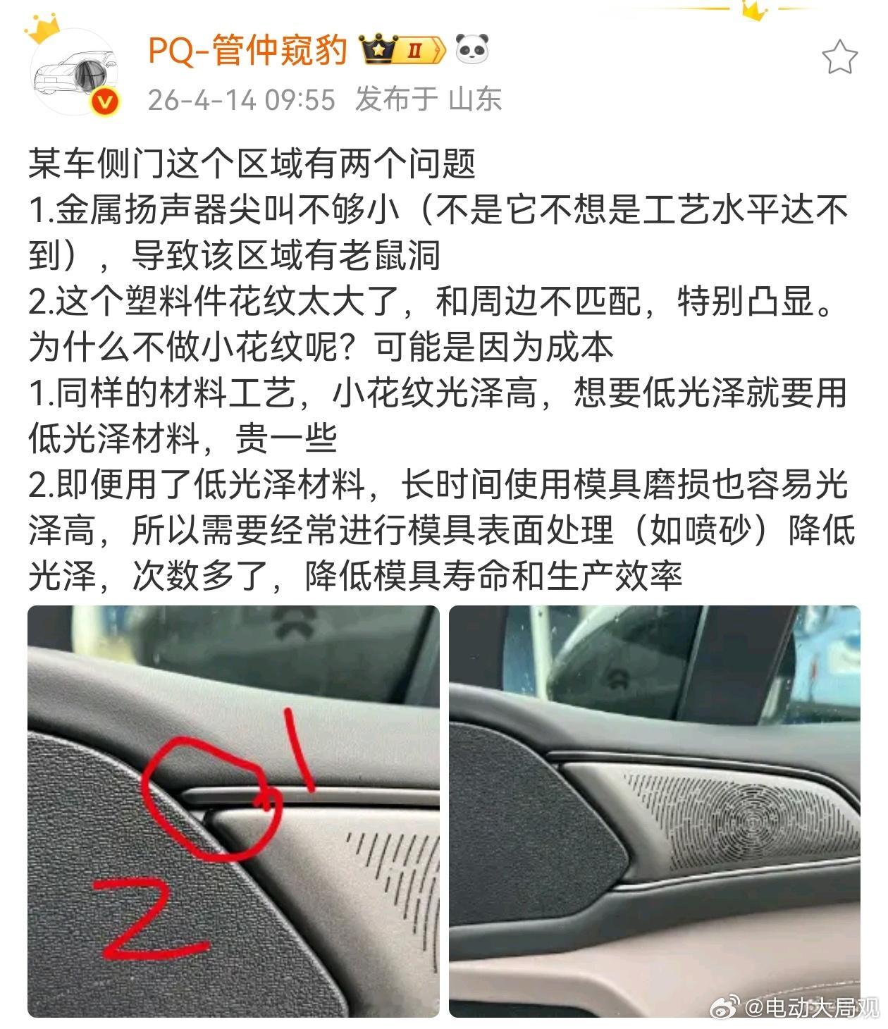 2.关于门板侧面的皮纹饰板你说花纹大你自己也解释了这是非高感知区域皮纹这样设计是考虑到耐磨等因素非常准确但是接着又说做细一点可能更好耐磨又不行你看又犯病了吧既要还要又要你自己都纠结了我上篇微博讲的PQ要懂得平衡与取舍你还是没有学会我希望你下次再发微博和提问题的时候扪心自问“如果是我 我会怎么选?”最后一张图是你现在开的那个SUV的实拍图他们在用户高感知区域都用了皮纹你又怎么说呢?