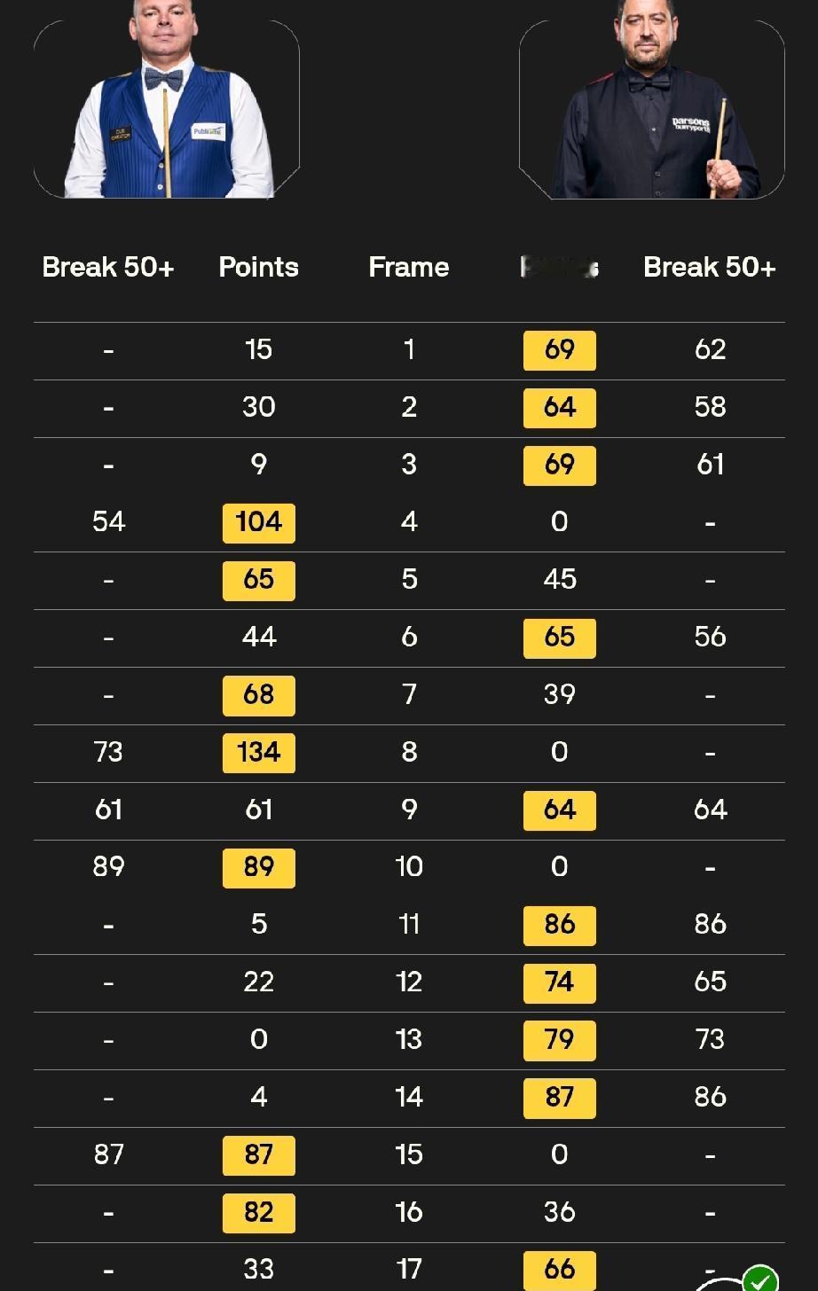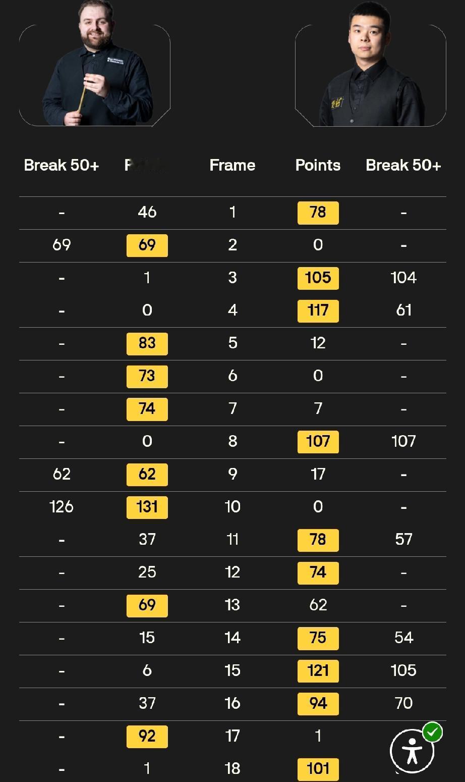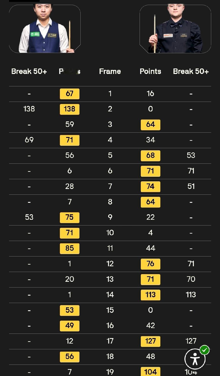 江俊与斯坦·穆迪战至9-9,决胜局功亏一篑,9-10不敌斯坦·穆迪,无缘正赛。