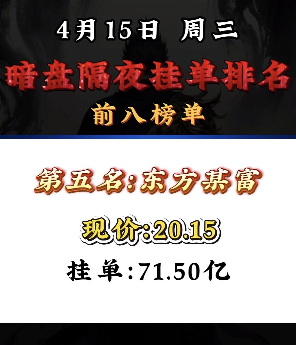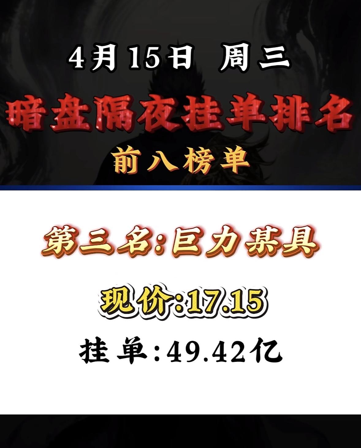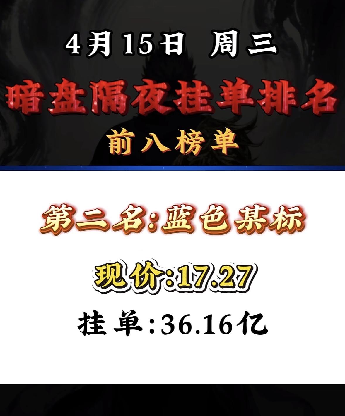 4月15日周三暗盘隔夜挂单排行榜揭晓