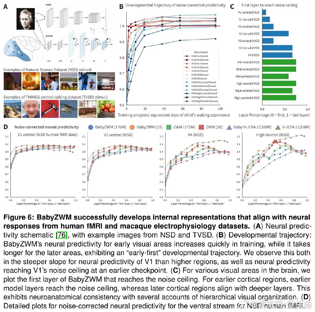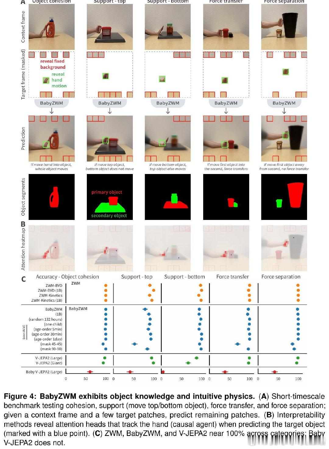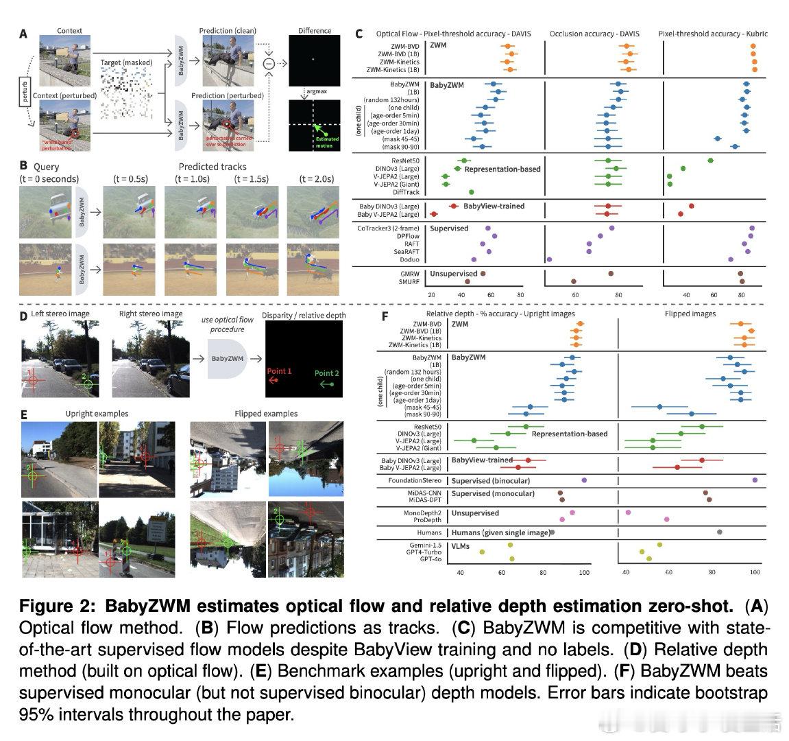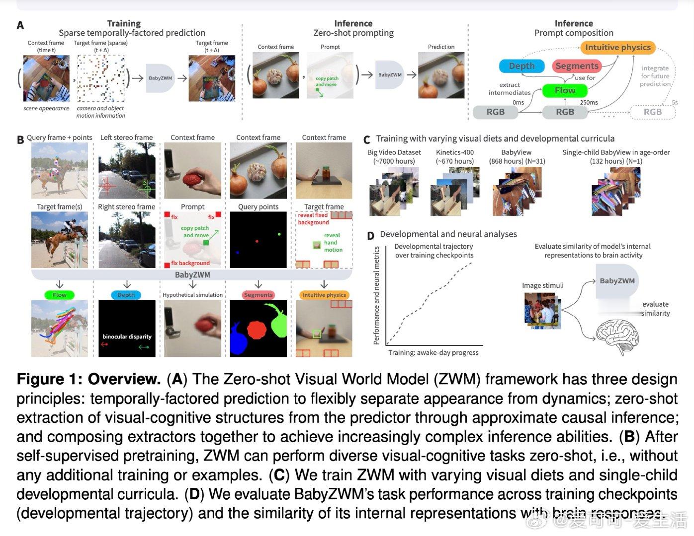 在视觉认知领域,如何从一个孩子有限的第一人称经验中涌现出深度感知、物体追踪、直觉物理等多种能力,是一个悬而未决的难题。现有的自监督视觉模型在婴儿级别的数据上训练后,性能远不及在精心策划的大规模数据集上训练的同类模型,且每项下游任务都需要额外的标注训练,使其既不高效也不灵活。