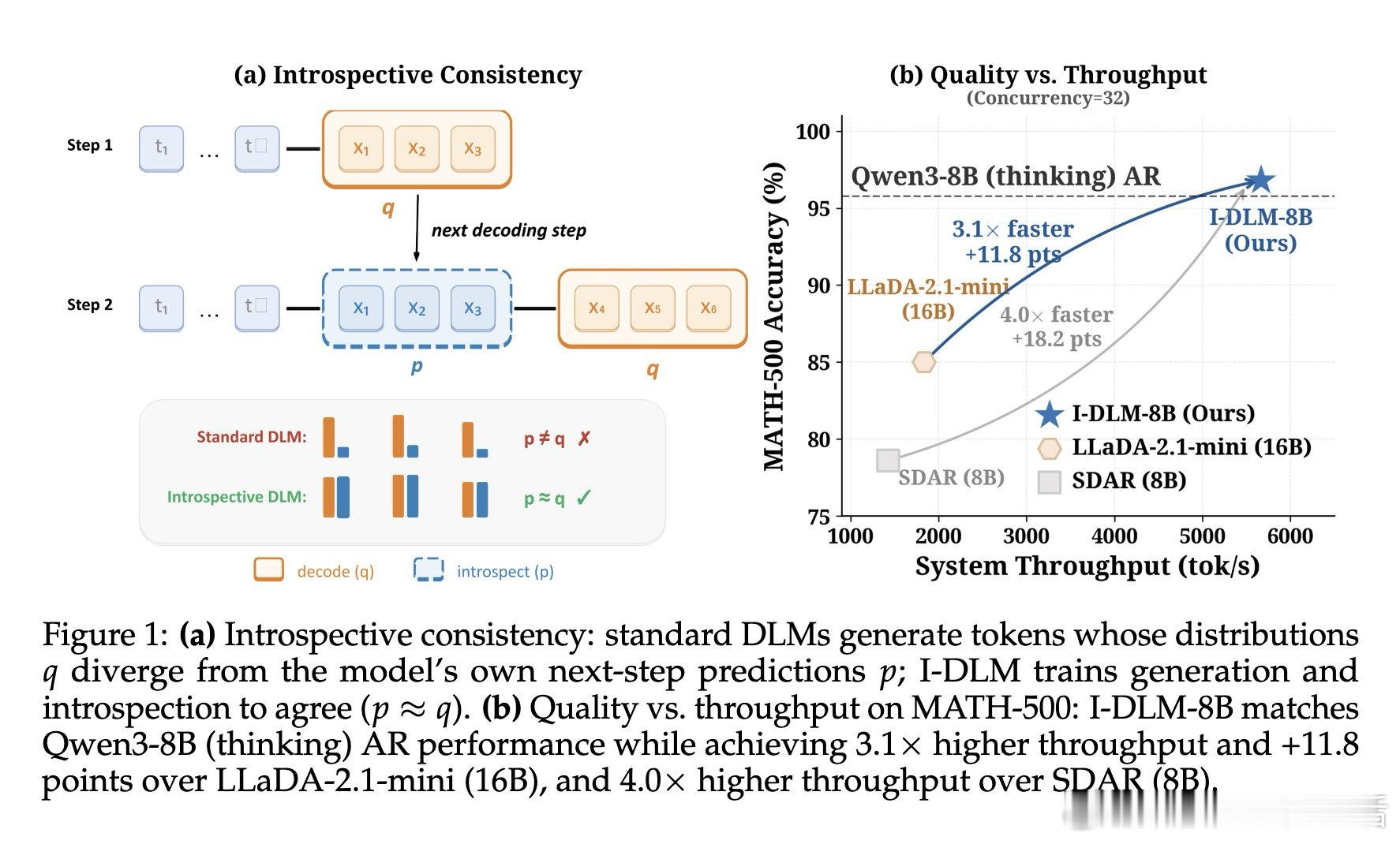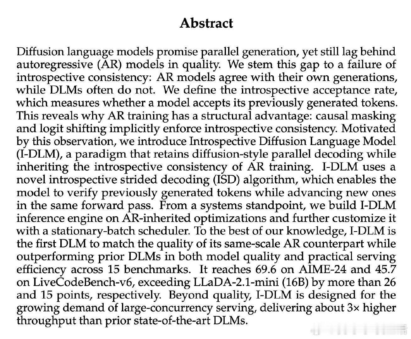 在扩散语言模型领域,"并行生成"这一承诺长期落空——即便能并行解码,生成质量始终与自回归模型存在显著差距。过去的方法受困于一个被忽视的根本缺陷:模型生成的token与它自身"反思"时认可的token之间存在分布鸿沟,本质原因是双向去噪训练从未教会模型认可自己的输出。