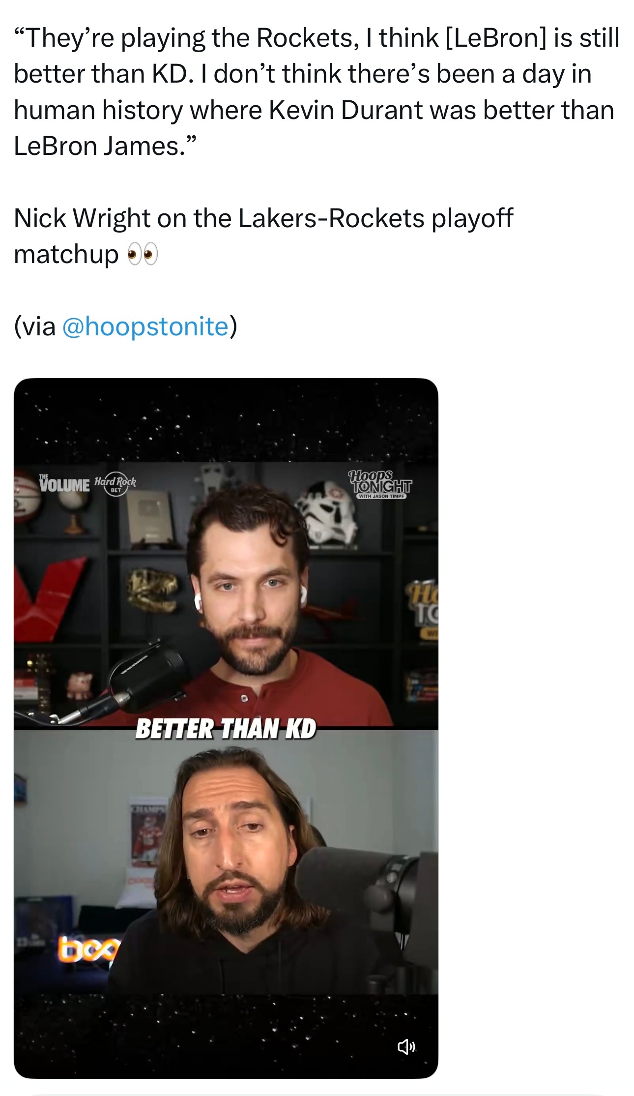 “他们要对阵火箭了,但我觉得勒布朗依然比杜兰特强。在我看来,人类历史上从来没有哪一天,凯文·杜兰特的实力能超过勒布朗·詹姆斯。”