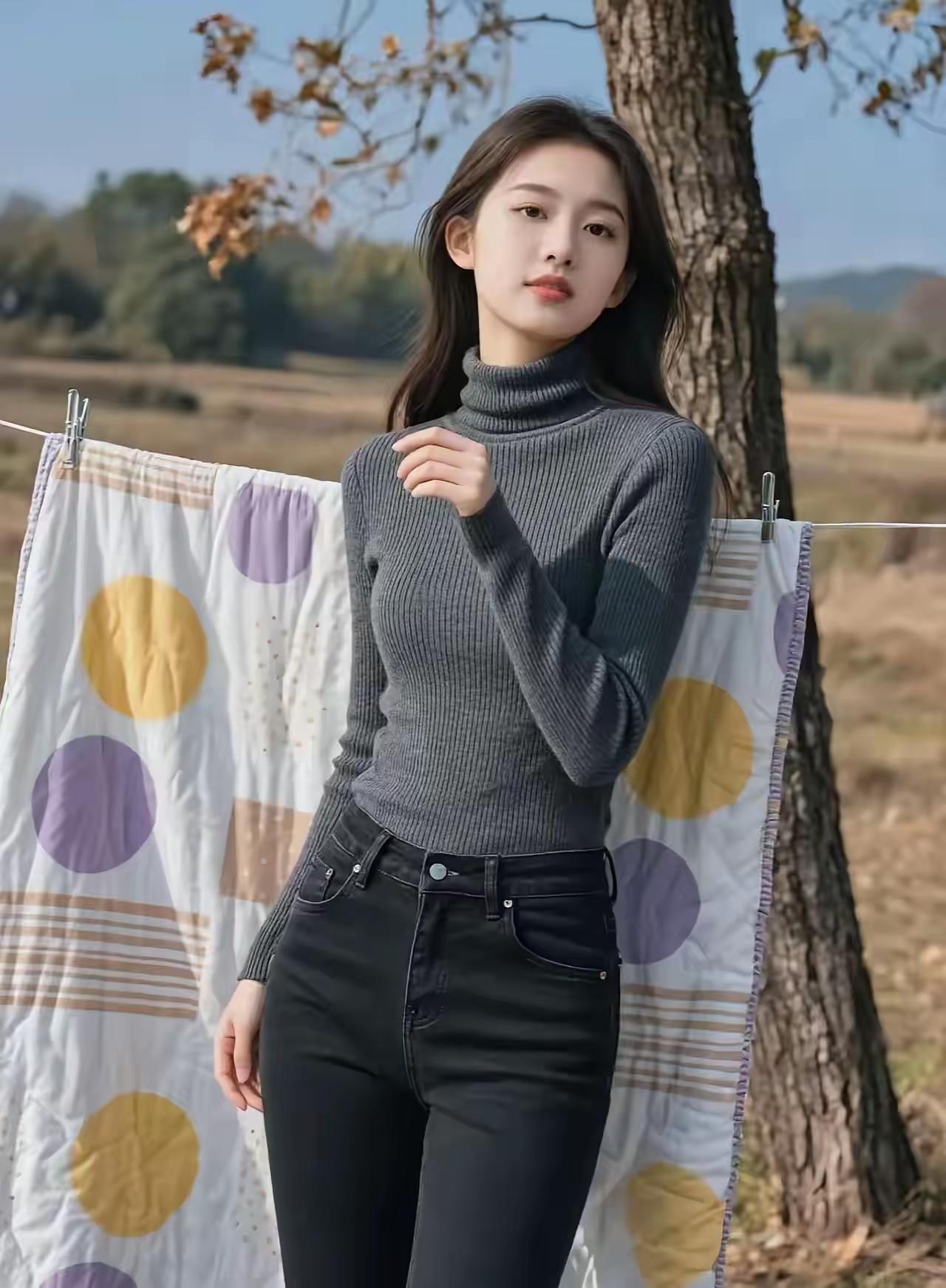秋日穿搭指南:灰色高领毛衣+黑色牛仔裤,简约时尚,轻松出街!🍂👗👖