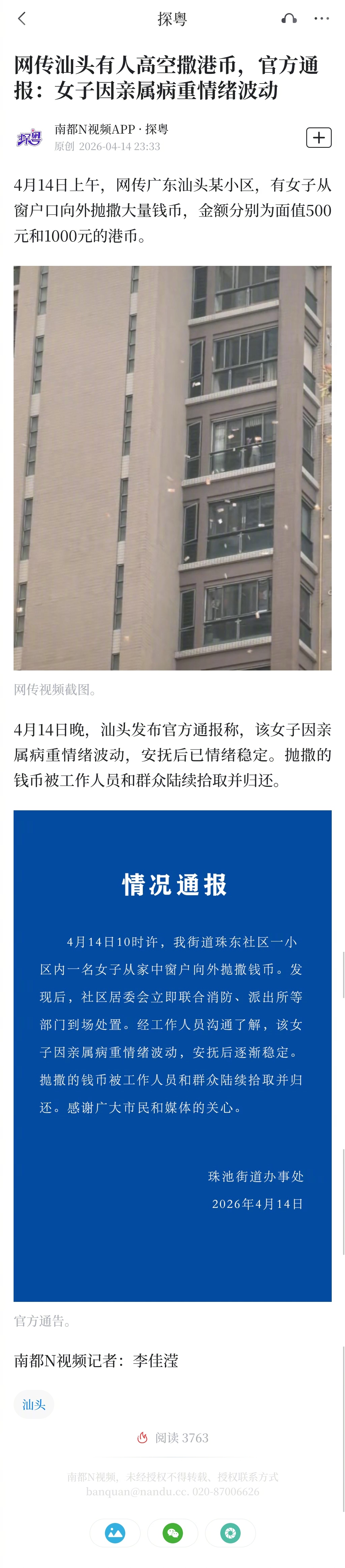#官方通报汕头女子高空撒港币#【网传汕头有人高空撒港币,官方通报:女子因亲属病重情绪波动】4月14日上午,网传广东汕头某小区,有女子从窗户口向外抛撒大量钱币,金额分别为面值500元和1000元的港币。4月14日晚,汕头发布官方通报称,该女子因亲属病重情绪波动,安抚后已情绪稳定。抛撒的钱币被工作人员和群众陆续拾取并归还。视频:南都N视频记者 李佳滢