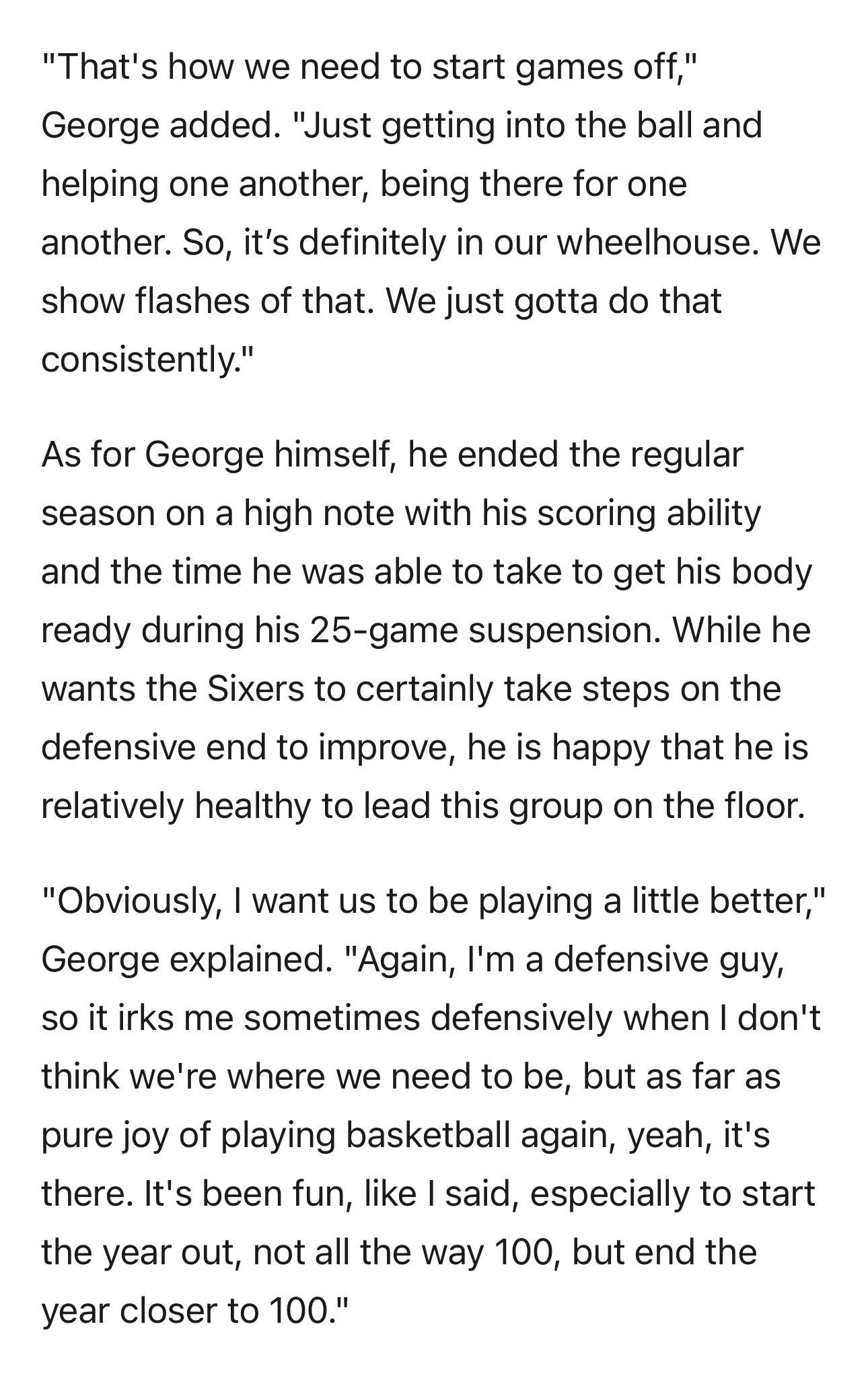 至于乔治本人,他常规赛收官阶段得分状态火热,且在25场禁赛期间充分调整,让身体恢复到了最佳备战状态。尽管他希望球队在防守端继续进步,但他也很欣慰自己能以相对健康的身体,在场上带领这支队伍。