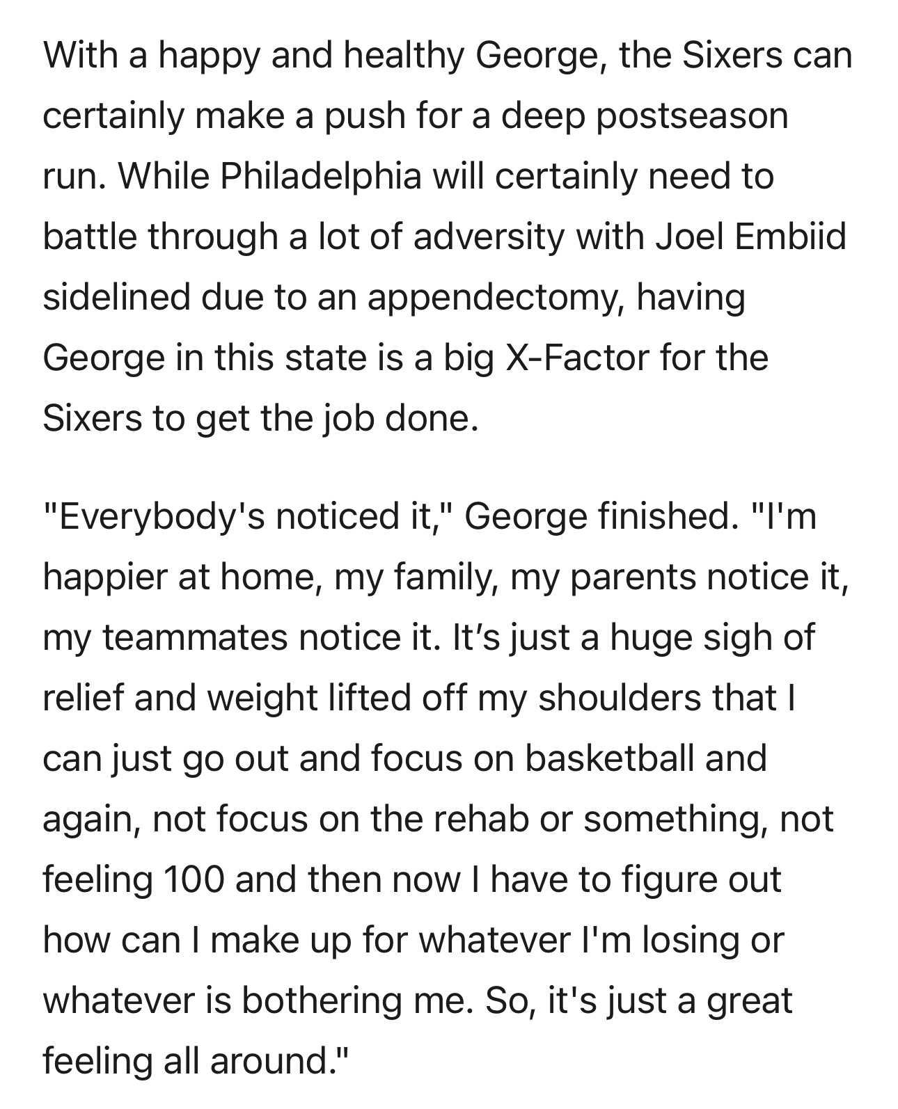 状态愉悦且身体健康的乔治,无疑能让76人队向季后赛更深轮次发起冲击。恩比德因阑尾切除手术缺阵,76人队需要克服重重困难,而处于目前状态的乔治,将是球队取胜的关键X因素。