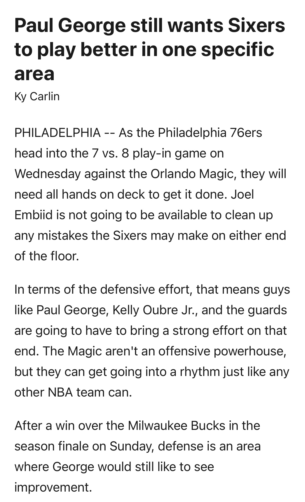 正如乔治所说,76人队某些时刻看起来像是一支防守密不透风的强队,但也有不少回合难以完成防守成功,这在不少比赛和关键节点都让球队付出了代价。周四对阵魔术队的比赛,球队防守必须思想统一、配合连贯。