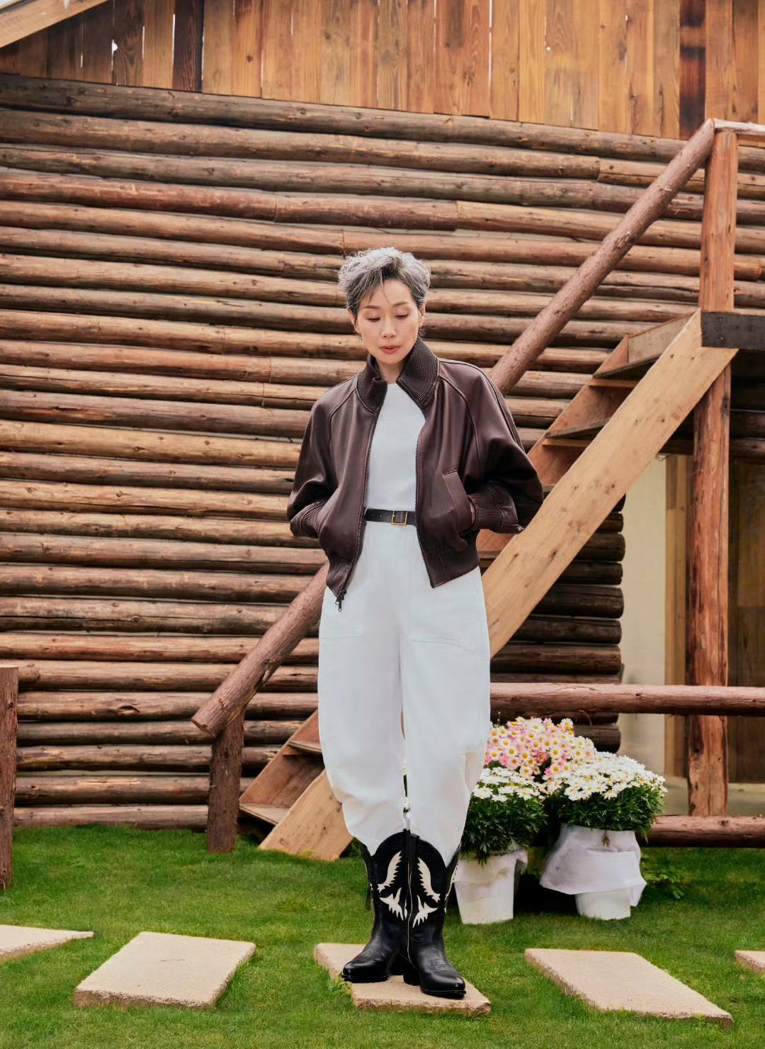 63岁叶童棕色皮衣穿搭分享:短款棕色皮衣搭配白裤,时尚酷感十足,手提黄绿色包包,
