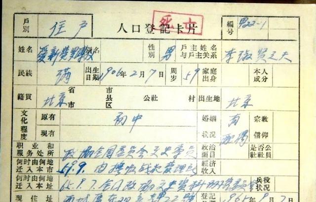 民警解释清楚后,他只能报出五妹家的地址,西城区前井胡同6号,就这样暂住登记进去。家庭出身和本人成分这两项也让民警和溥仪都觉得难办,因为他的情况跟一般人完全不一样,最后只好空着没填。