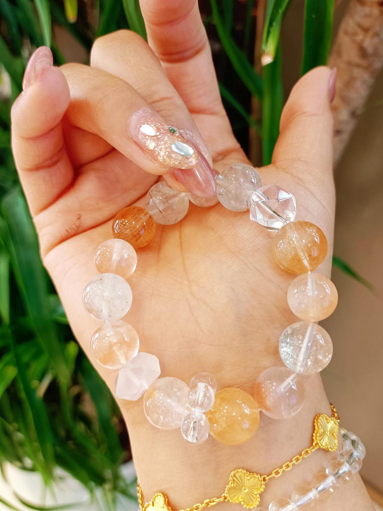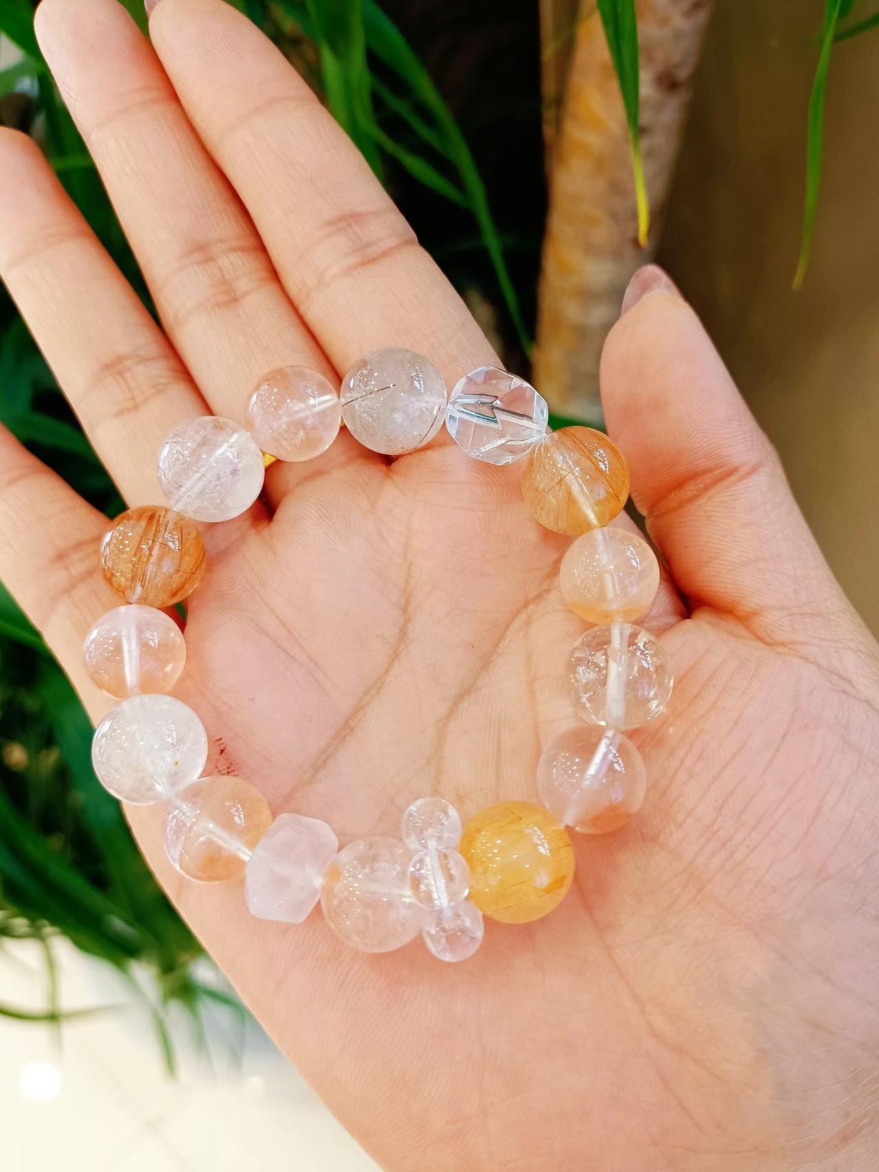 清新自然,晶莹剔透的玉珠手链,搭配绿色植物,尽显优雅与自然之美。